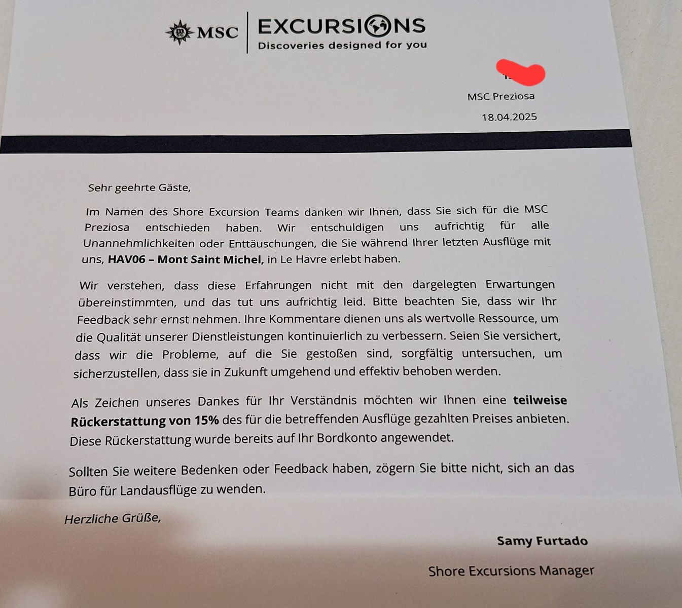 Das Schreiben mit der Info war am nächsten Tag auf der Kabine.