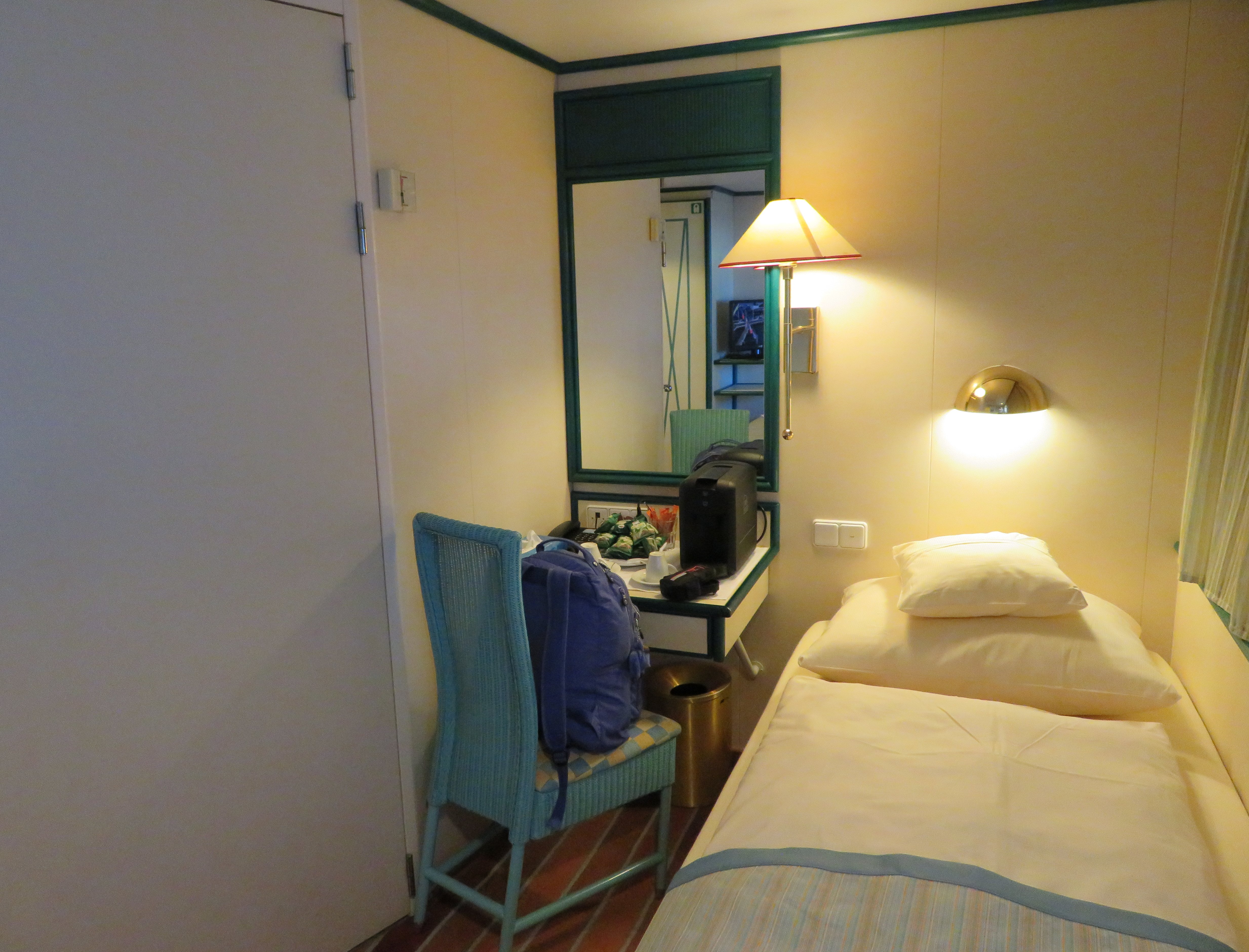 Hier noch ein paar Bilder der Kabine. Ich kann mir ehrlich gesagt nicht vorstellen, wie ein Rolli-Fahrer mit Begleitung in der Kabine zurecht kommen soll. Es ist doch recht wenig Platz und wenn ich daran denke, wie anstrengend es ist, den Koffer auf dem Teppich zu ziehen.