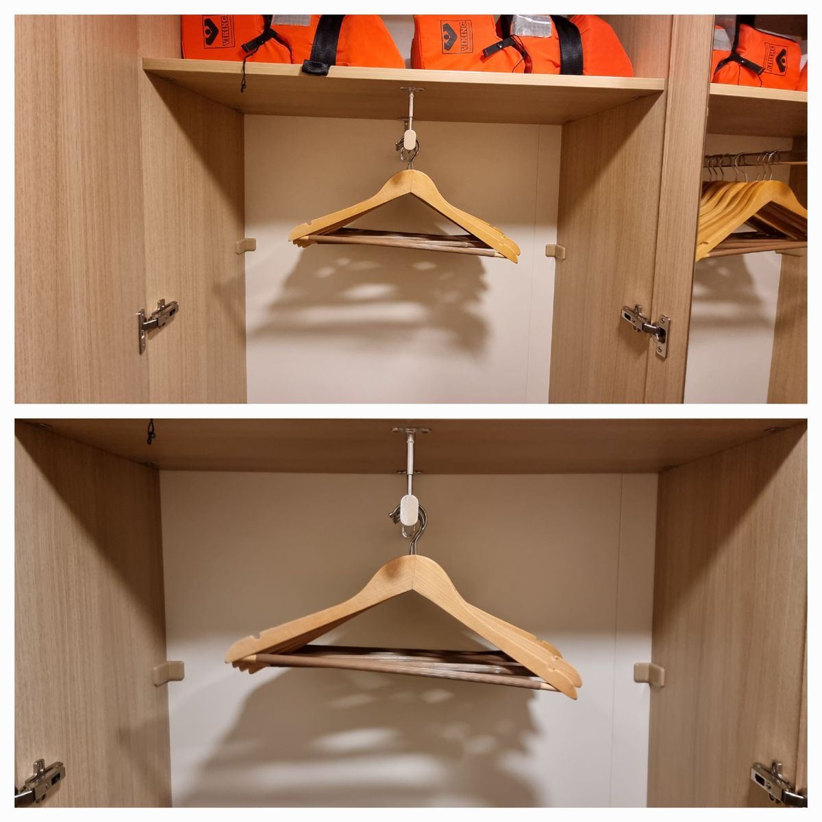 Wenn man in die Kabine rein kommt ist Links der Schrank, erstes großes Schrankteil mit Stange mit VIELEN Bügeln. Was komisch ist, die Stange geht nicht von rechts nach links sonder von hinten nach vorne, siehe Bild, keine Ahnung was man sich dabei gedacht hat, Platz genug wäre für die "normale" Lösung. Die 3. Tür ist dann der Fächerbereich mit unten 2 kuscheligen Decken und ein Fach nimmt der Safe ein.