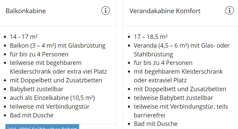 Bei Verandakabinen gibt es ein paar mit Stahlbalkon, sowie die berüchtigten Spannerkabinen.