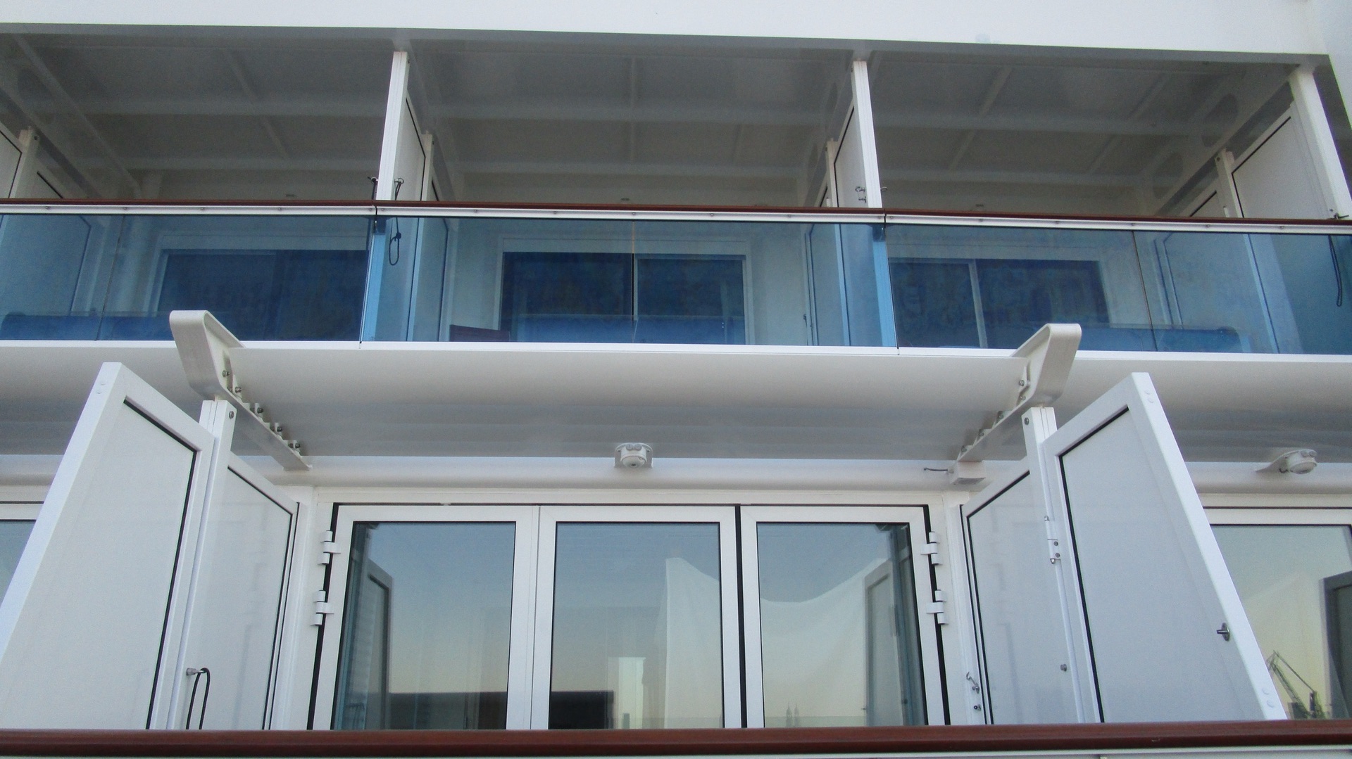 Auf dem Balkon stehend sieht man mehr oder weniger von der darunter liegenden Deck 8 Kabine nur das Dach und ein bissl von deren Terrasse.