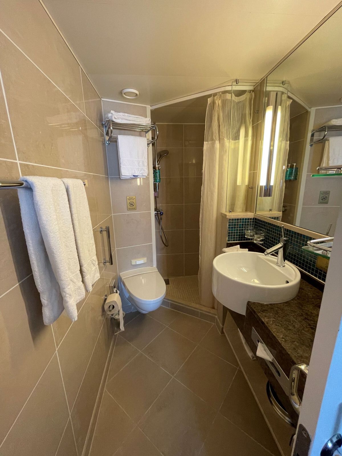 Die Kabine selbst lag sehr ruhig. Keine störenden Geräusche. Sie liegt in der Nähe der vorderen Fahrstühle. Eine Treppe höher und man kann auf das Außendeck oder durch die Harrys Bar in die Restaurant.