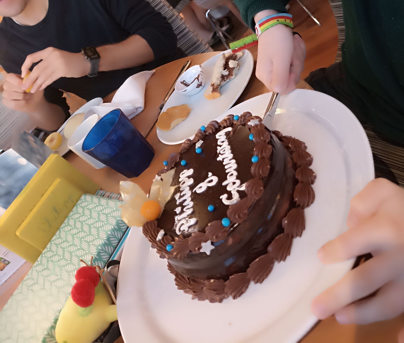 Das war die kleine Schokotorte für Philipp auf der Cosma letzen Februar. War lecker, aber auch echt "mächtig" . Ich rate definitiv dazu nur eine kleine zu bestellen: reicht für 4 üppig. Der Tisch wurde im Yachtclub zum Frühstück wie bestellt reserviert und hübsch eindegedeckt und es gab von Aida auch eine Geschenktüte am Tisch. Eine große Gruppe Kellner kam um laut singendl Krach machend zum gratulieren. Das haben wir nicht bestellt und machen Sue automatisch, glaube ich (Philipp trug es mit Fassung😁). Vom Kids Club war dann nochmal ein Geschenk auf der Kabine. Wir können daher nur sagen: Kindergeburtstag auf AIDA ist wirklich schön für die Kids
