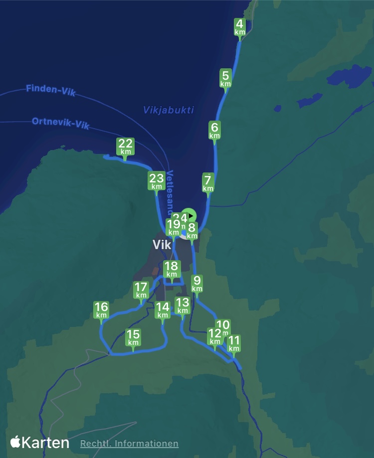 Im letzten Hafen der Reise bin ich noch den Ausflug „Viks Highlights mit dem E-Bike erkunden“ mitgefahren. Es gab drei verschiedene Bike-Ausflüge in Vik, und dies war der kürzeste und ging über 24 km. Da wollte ich gerne noch mehr Zeit auf eigene Faust haben. Ich glaube, in der Ausflugsbeschreibung steht etwas weniger. Unser Guide sagte uns jedenfalls gleich zu Beginn, dass der Ausflug mit drei Stunden viel zu lang geplant ist, aber die Landseite bekäme es nicht hin, das mal zu ändern. Er würde sich jedenfalls am Schluss, je nachdem wie schnell wir sind, noch ein bisschen was ausdenken, wo wir noch hinfahren, und ein bisschen improvisieren.