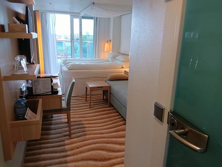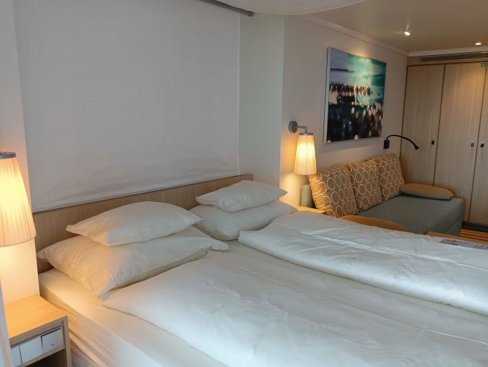 Im Vorfeld war diese Kabinenkategorie für Alleinreisende buchbar. So dachte ich mir, dass ich unter Umständen so schnell nicht wieder die Chance habe, mir diesen kleinen Luxus gönnen zu können und entschied mich eben für diese Kategorie. Gebucht hatte ich im Variotarif gut vier Wochen vor Reisebeginn. 29 Tage vorher wurde sie mir zugeteilt.