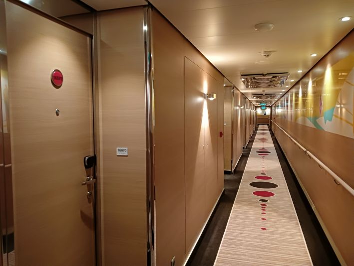 Es handelt sich um eine Kabine für bis zu drei Personen auf Deck 16, Backbordseite, ganz in der Nähe der vorderen Fahrstühle sowie unweit des Beach Clubs, von dem aber nicht das geringste zu hören war.