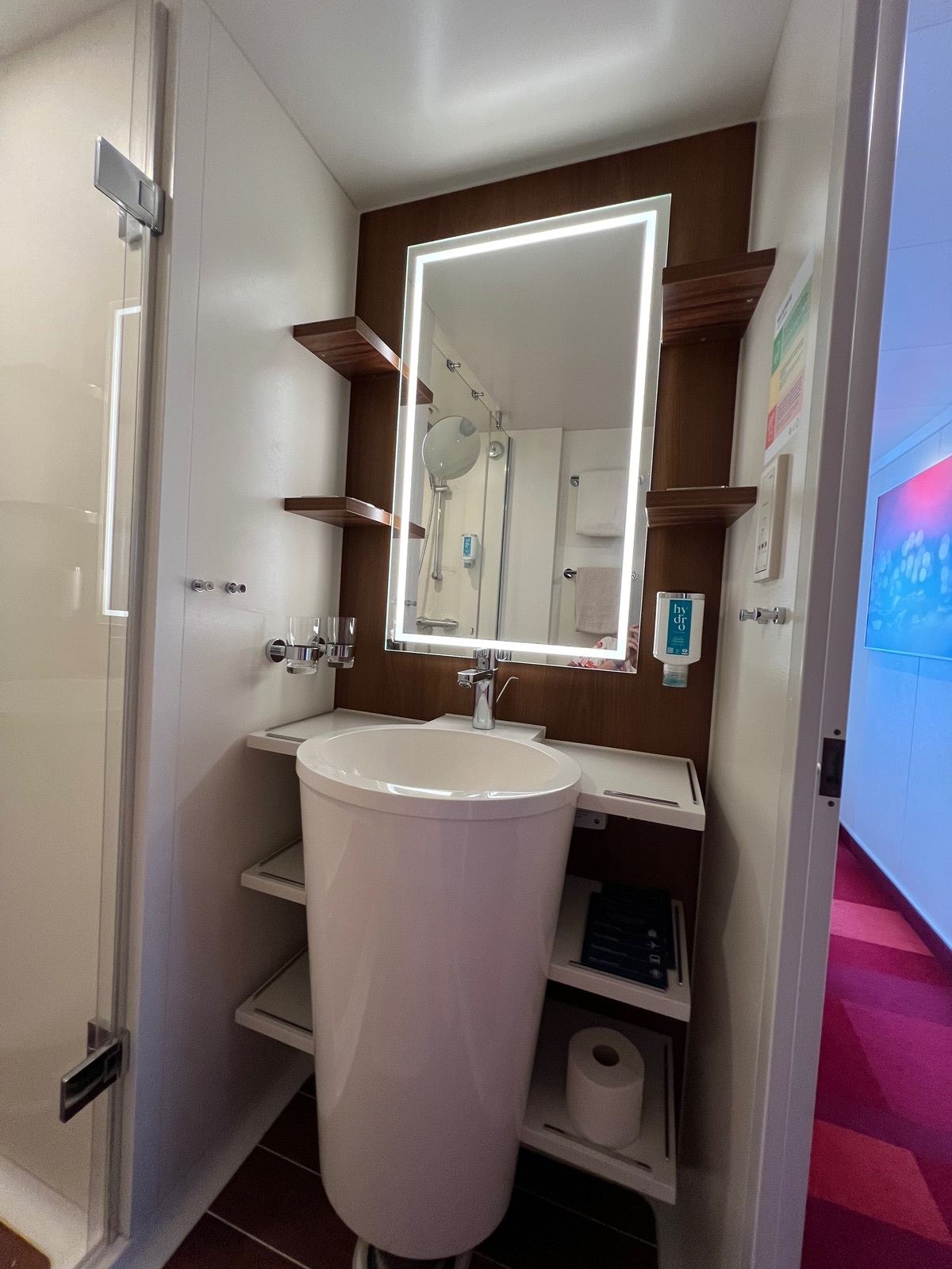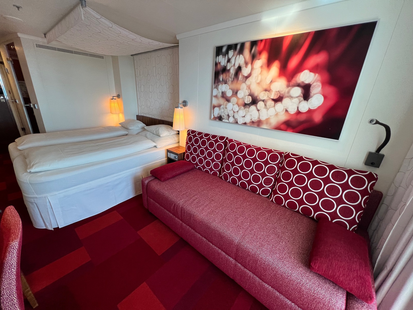 Kabine ist schön gewesen, innen rot, begehbarer Kleiderschrank. Verbindungstüre (Nachbarn hörte man nicht)