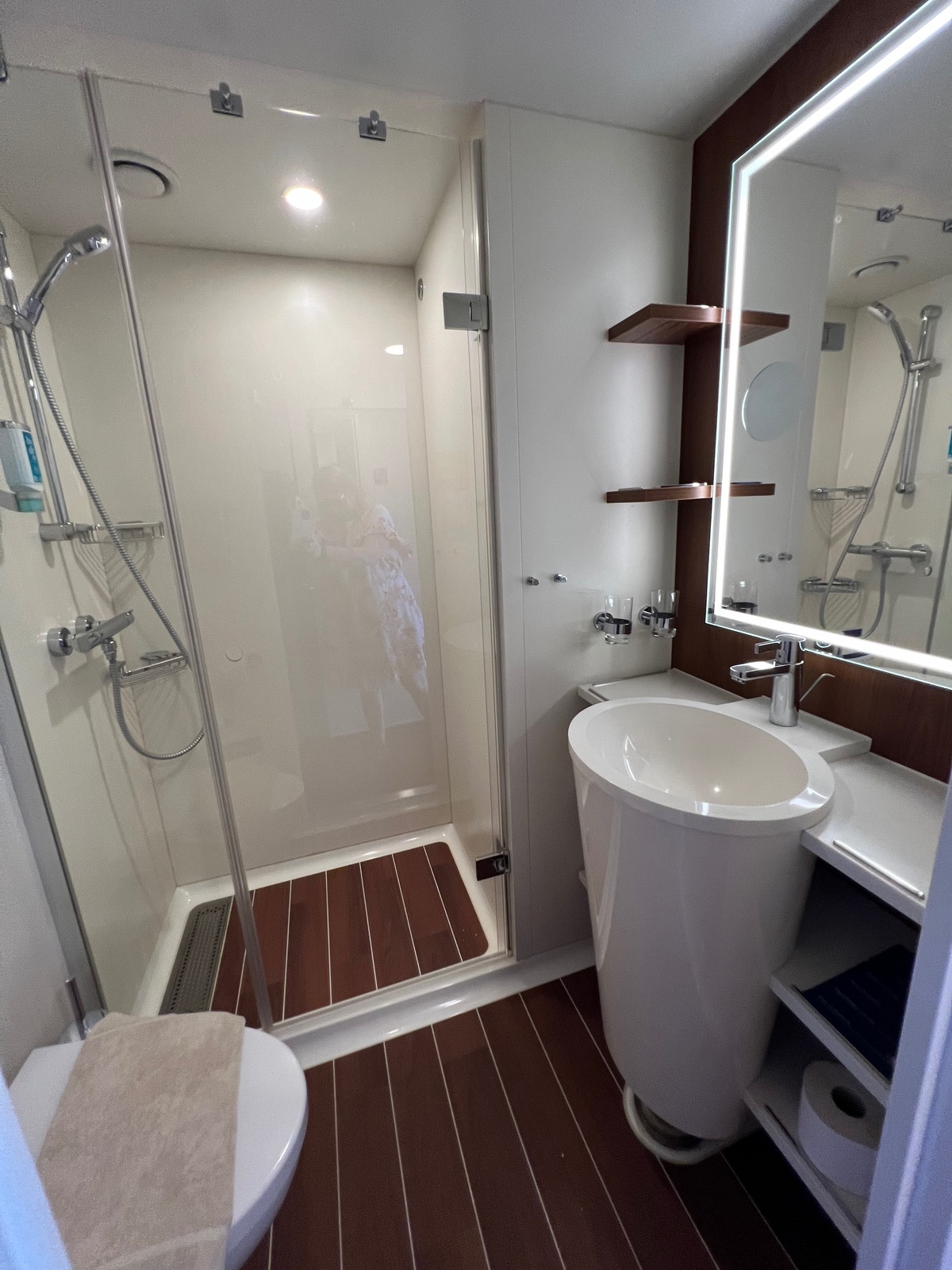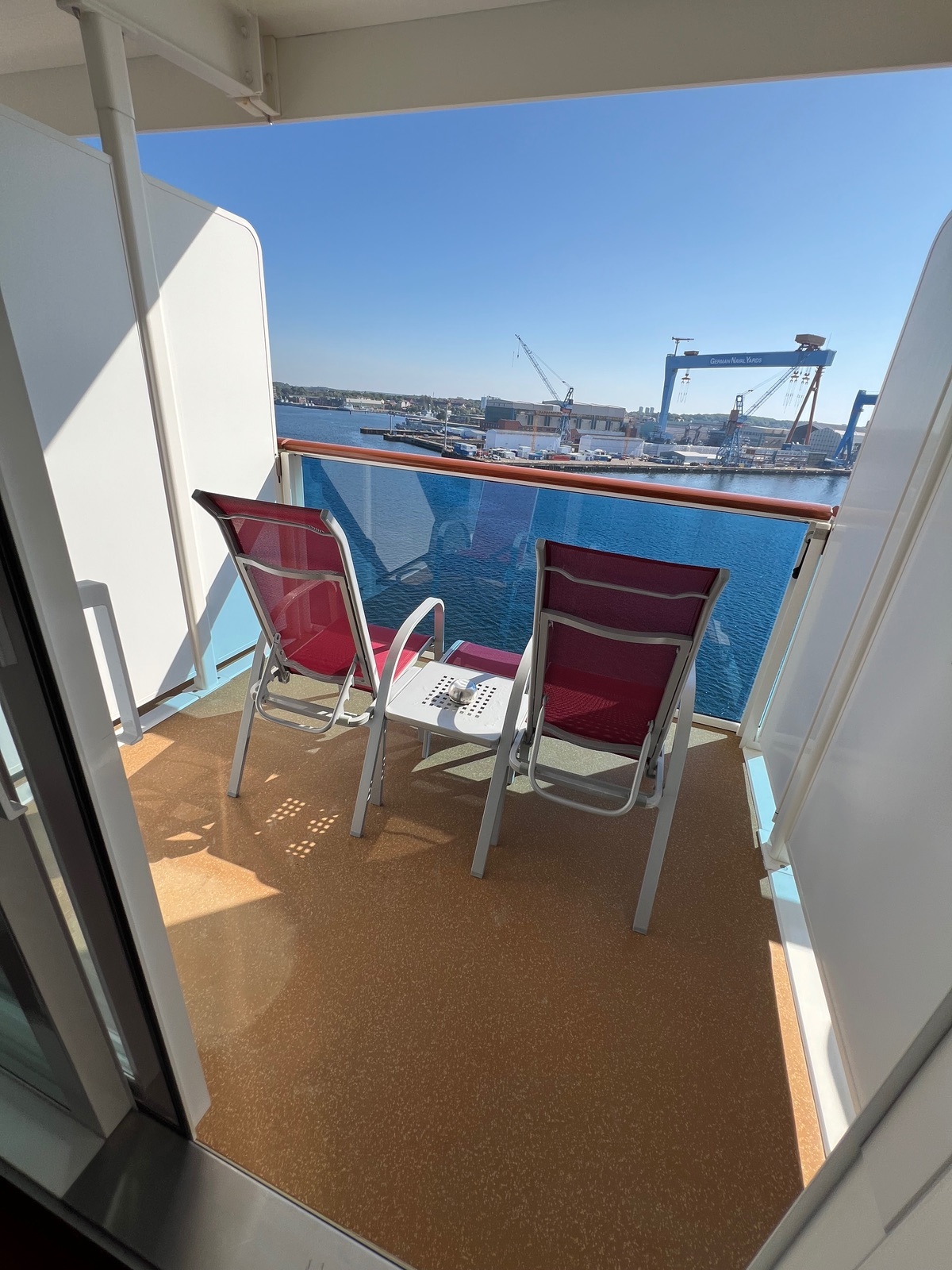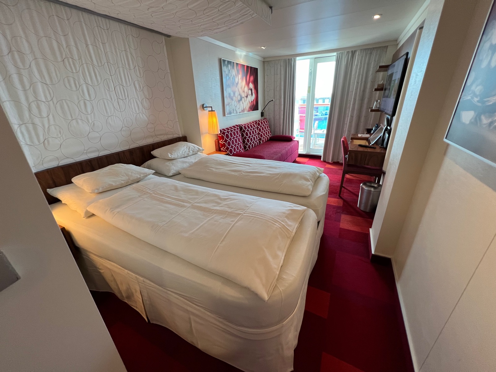 Kabine ist schön gewesen, innen rot, begehbarer Kleiderschrank. Verbindungstüre (Nachbarn hörte man nicht)