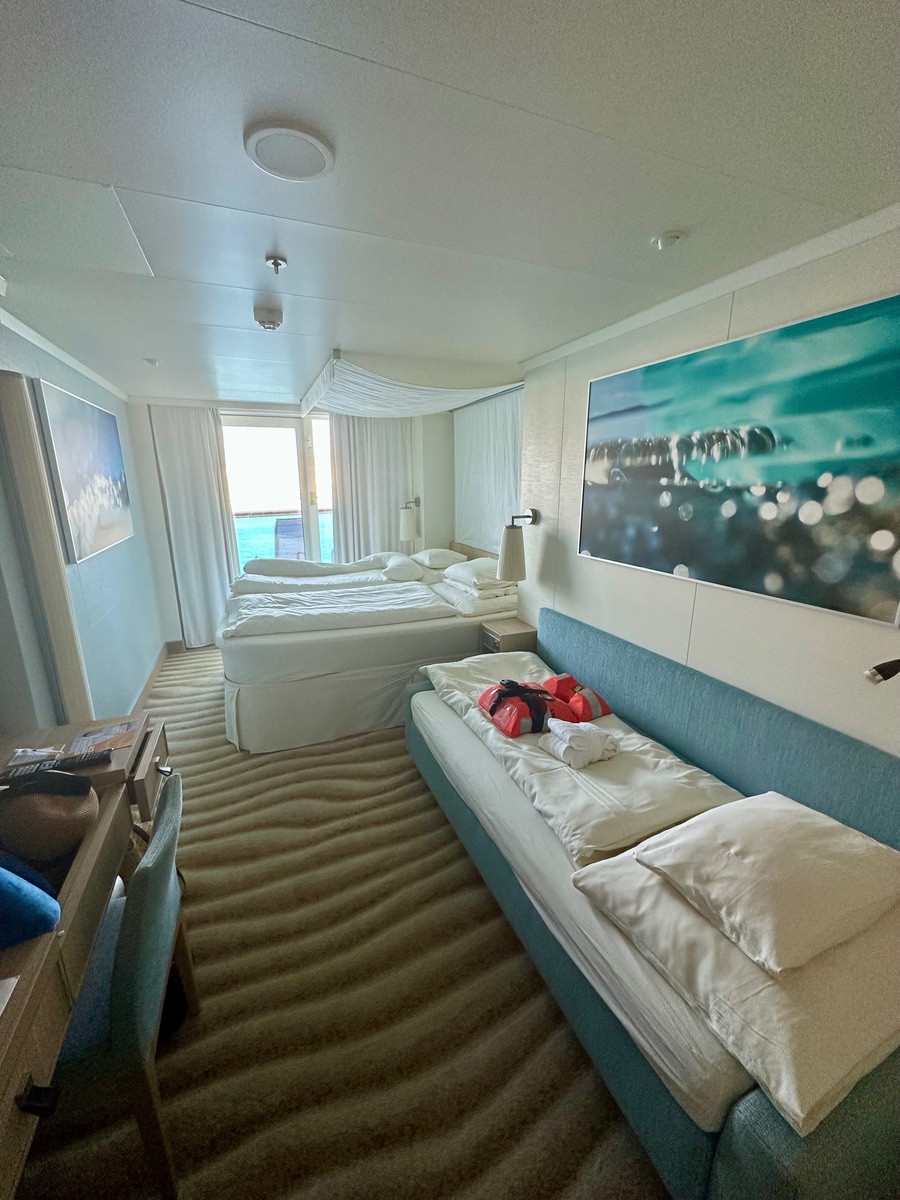 Es ist eine Balkonkabine für 3 Personen, die Farbgestaltung ist hellblau mit hellen Holzmöbeln. Der Teppich erinnert an Sandstrand. Es gibt keinen begehbaren Kleiderschrank. Für uns 3 hätte ich den Schrankplatz etwas knapp empfunden. Dafür ist die Kabine an sich etwas geräumiger und das Bad fand ich von der Aufteilung her besser als in unserer eigentlichen Kabine.