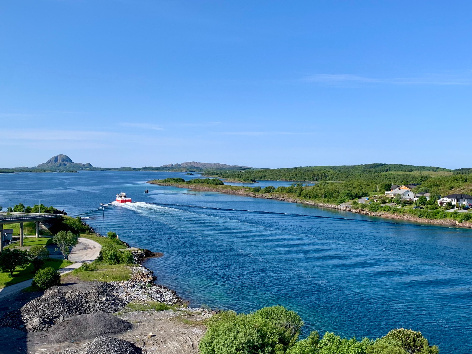 Zuerst Ich bin aber zu einer Brücke gelaufen mit fantastischen Blick auf das Ort und auf der andere Seite auf Torghatten. Es sind ungefähr 6 km hin. Man halbiert die Strecke um die Hälfte mit Shuttle Bus bis zum Ort ( Hafen-Ort Kern 3 km). Allerdings kostet der 12 Euro.