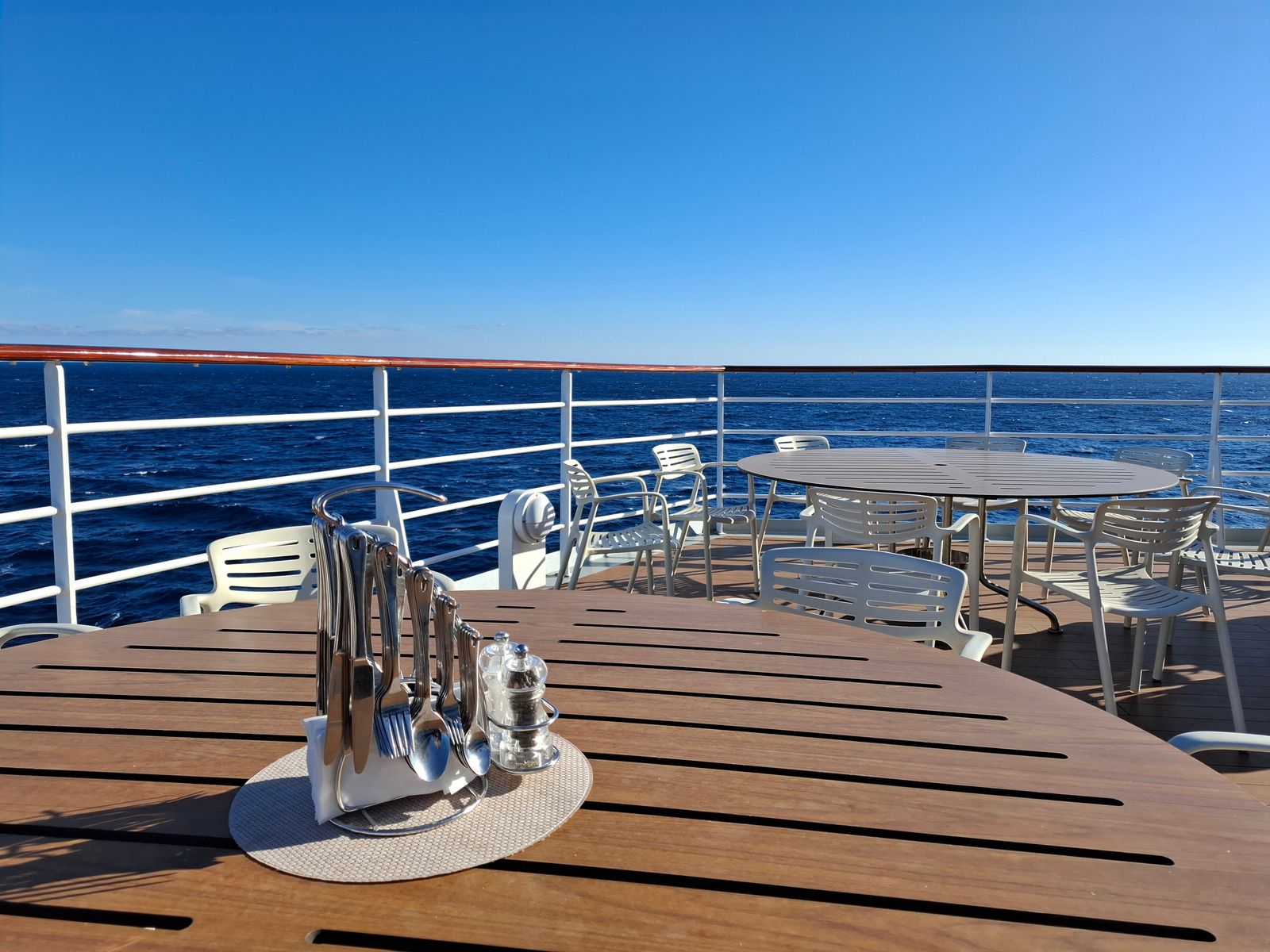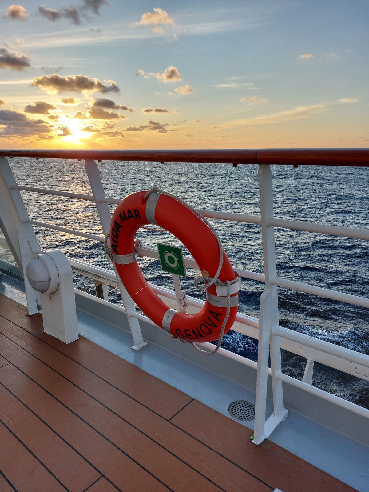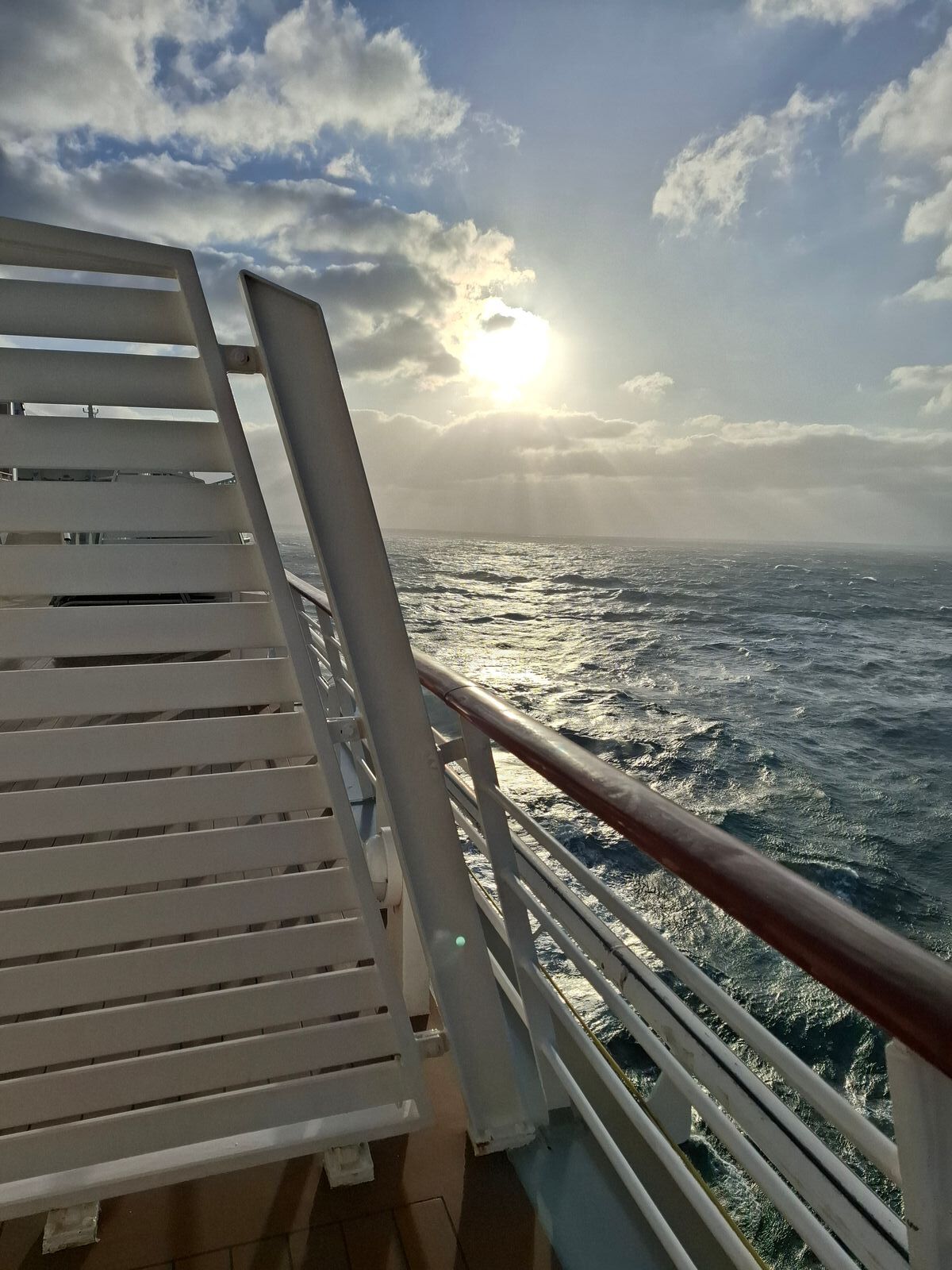 2) Die Sonne 🌞 ist 'rausgekommen und die ersten Mitreisenden haben sich einen windgeschützten Platz an Deck gesucht und diese genossen.