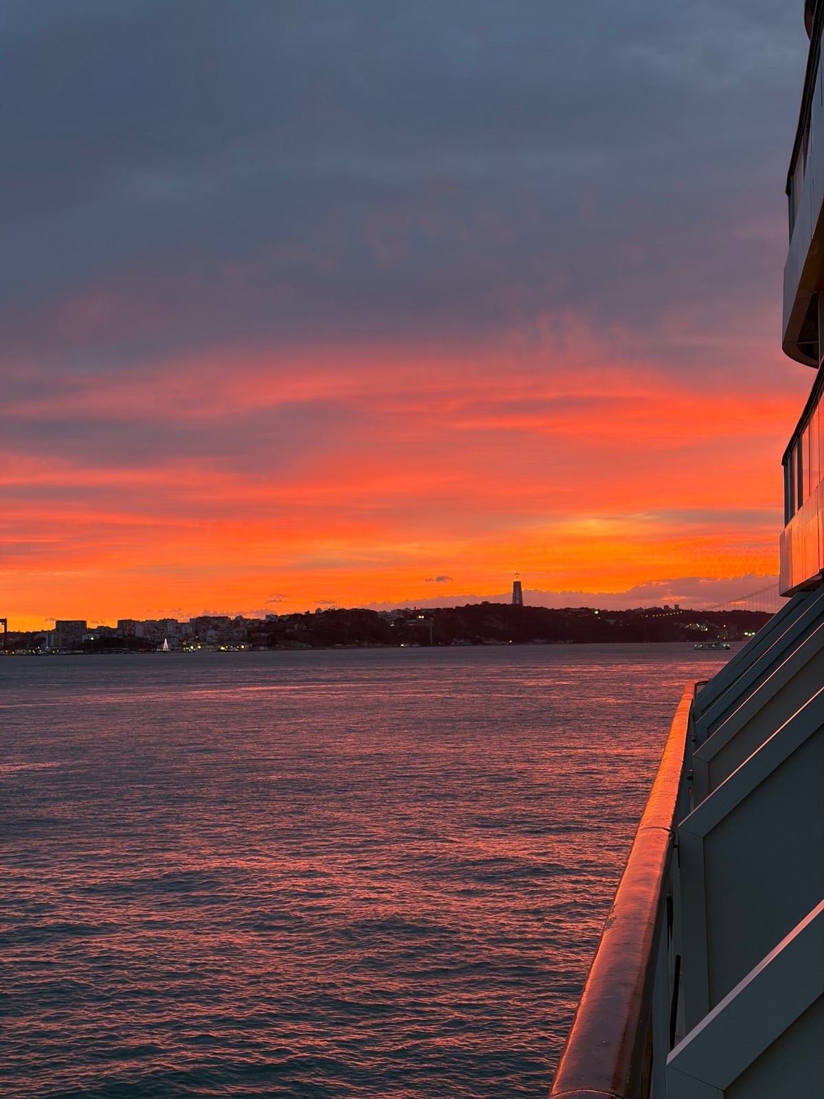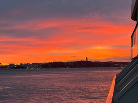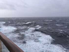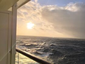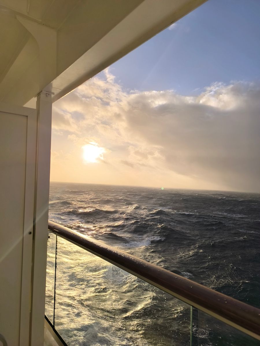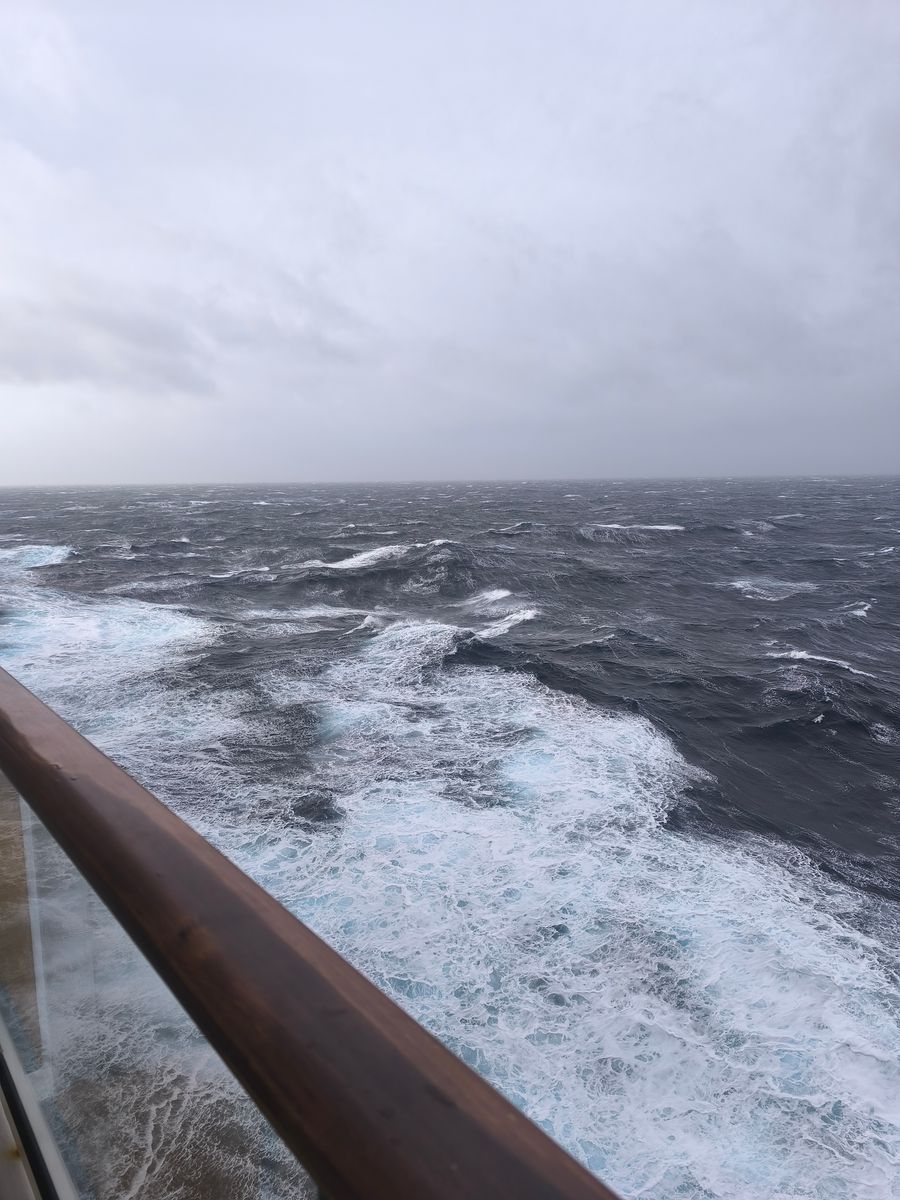 Soeben kam die Durchsage des Kapitäns das der Sturm schneller als erwartet ist und wir das schlimmste hinter uns haben, und das war nicht so dramatisch. Und jetzt kommt die Sonne noch zum Vorschein.