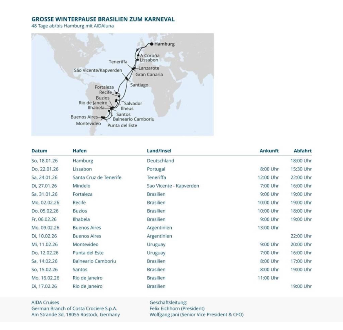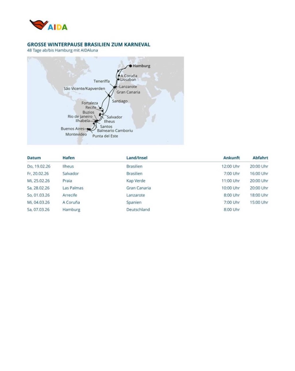 - RE: AIDAmar: Große Winterpause Brasilien zum Karneval | 48 Nächte | 18.01.2026 bis 07.03.2026 (Sonntag, 18. Januar 2026, 00:00-Samstag, 7. März 2026, 00:00)
