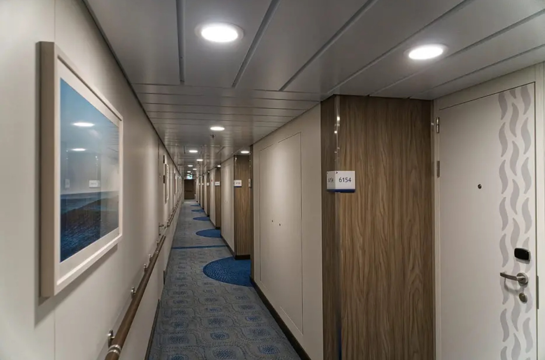 Bei Mein Schiff sind die Türen der Außen- und Balkonkabinen auf den Gängen noch mehr nach innen versetzt. Wenn man die Tür aufmacht steht diese nicht im Gang offen, da kommt es nicht zu Unfällen.