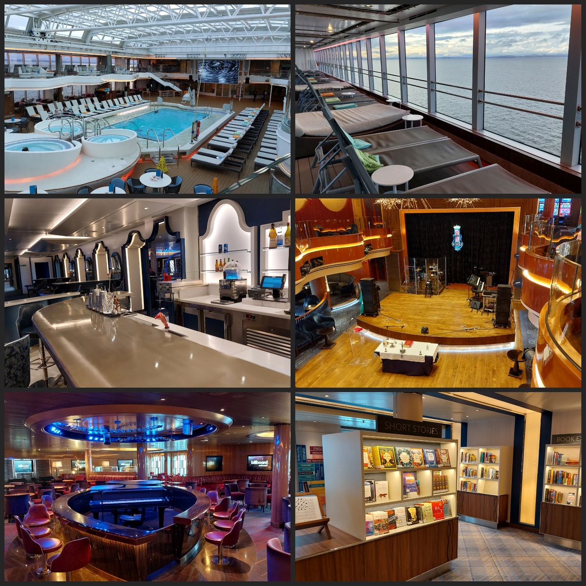 Gestern Abend haben wir dann eigentlich nicht mehr viel gemacht, außer uns noch was das Schiff anzuschauen und uns vorne auf Deck 12 im Crown's Nest hinzusetzen und die Aussicht nach vorne bei untergehender Sonne mit dunklen Regenwolken anzuschauen.