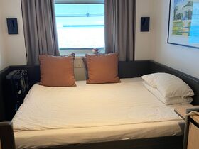 Die Kabine 5485 hat eine Sichtbehinderung durch den Rumpf eines Tenderboots, der ziemlich tief vor dem Fenster hängt. Leider habe ich kein Foto gemacht. Eine Kabine, die "nur" ein Rettungsboot davor hat, ist von der Sicht etwas besser, z. B. 5621 oder 5619. Von einer dieser Kabinen stammt auch das angehängte Foto, weil es ansonsten gleich ist. Die Betten lasse ich mir als Alleinreisende immer zusammen stellen für etwas mehr Schlafkomfort (finde ich).