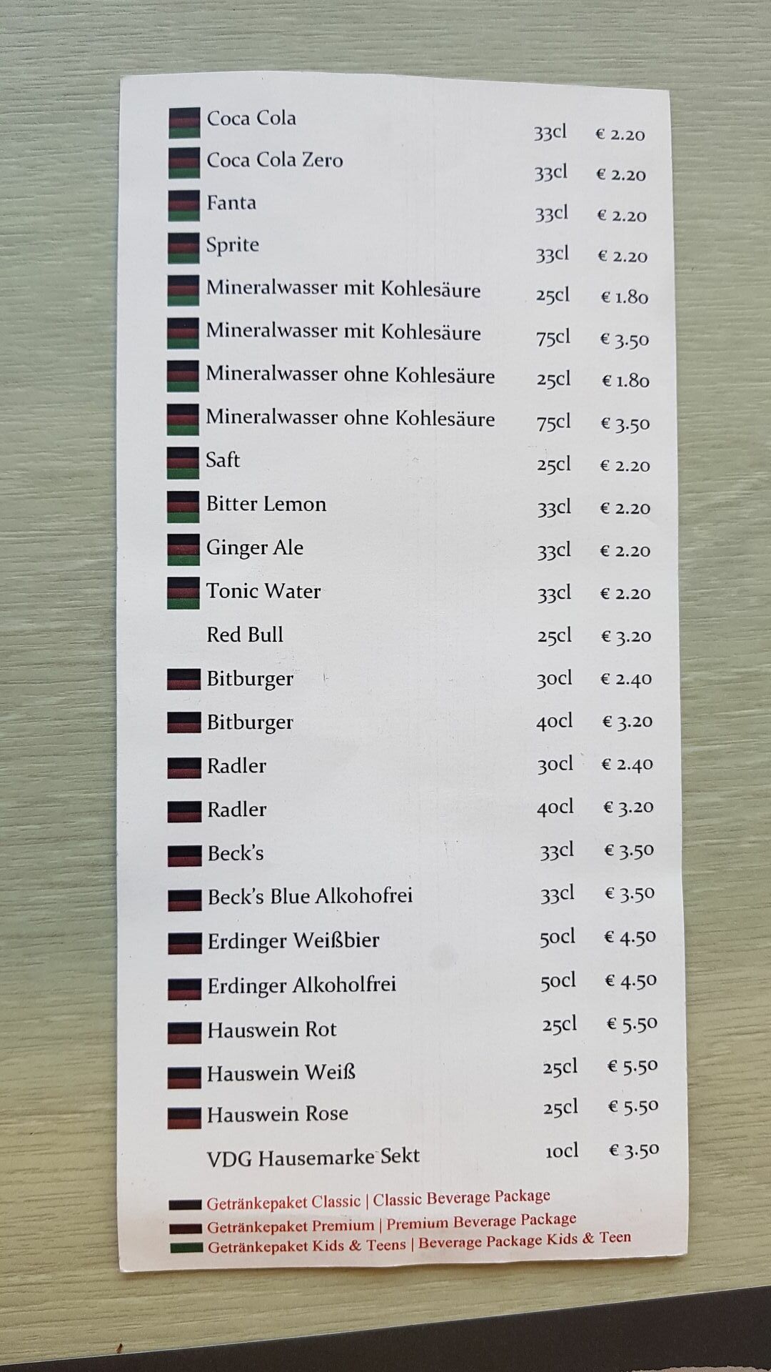Zum Mittag- und Abendessen musst Du alle Getränke beim Kellner bestellen und bezahlen.