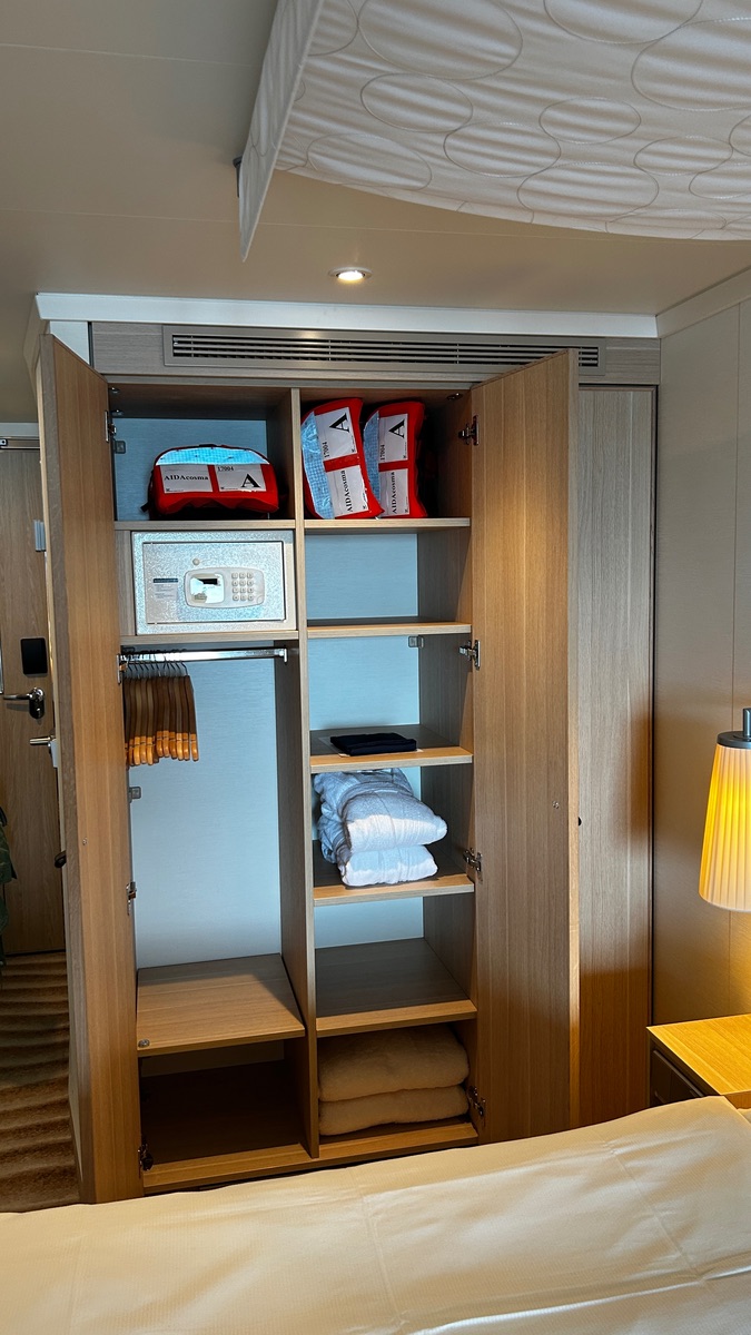 Die Kabine ist schön groß, durch den Wegfall des begehbaren Kleiderschranks hat man in der Kabine und auch im Bad mehr Platz. Die Farbgestaltung ist hell und "urlaubig". Der Zustand von Möbeln, Teppichen usw. war augenscheinlich sauber. Allerdings kann man bei guter Nase schon riechen, dass der Teppichboden lange in Benutzung ist und wer weiß wieviel nackte Füße darüber gelaufen sind oder bestimmte Flüssigkeiten sich darauf verteilt haben. Aber ich hab bisher noch keine Kabine bei der Aidaflotte gehabt, in der dieser Teppich nicht gerochen hat.