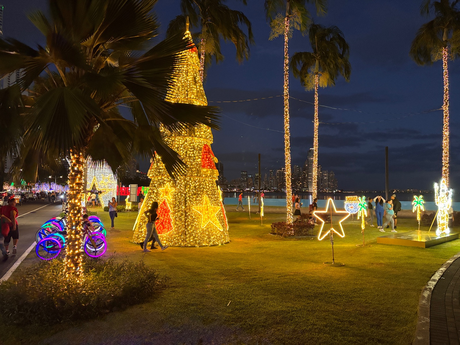 Nach zwei Drinks trafen wir unseren Fahrer, Jorge, leicht verspätet. Da er unsere zeitliche Gelassenheit bemerkte, bot er uns an, die weihnachtlich geschmückte Skyline und das neue Kreuzfahrtterminal auf der anderen Seite der Stadt zu besichtigen.