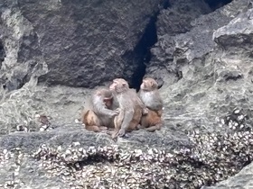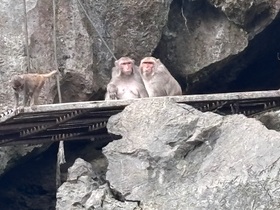 Überraschung – eine Gruppe neugieriger Makaken, die dort ihr Revier haben.