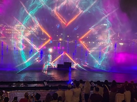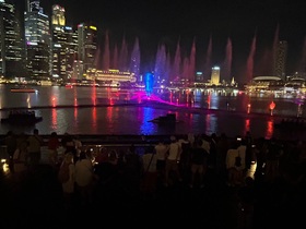 Getrieben von den Menschenmassen weiter zu den Lichtspielen vor dem Marina Bay sends Hotel. Laser Show