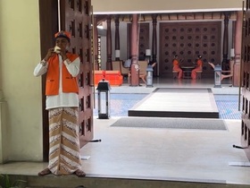 Der Empfang mit Gesang sowie Trommel im Hintergrund und vorne das blasen in eine Muschel