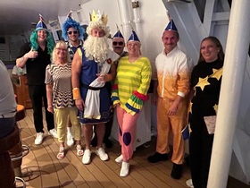 Am Abend wurde es offiziell unter der Narrenkappe. Die Offiziere tauschten ihre Autorität gegen puren Übermut. Sogar der Kapitän ließ sich als Zeus breitschlagen und bildete mit seiner Crew einen Elferrat, der vermutlich jeden Eisberg einfach weggelacht hätte.