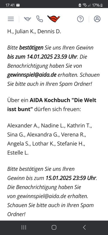 Ich habe zur Sicherheit in der Hotline angerufen und meinen Namen nochmal bildlich dargestellt, vielleicht konnten die Mitarbeitdenden bei AIDA die Gewinne nur nicht richtig zuordnen.