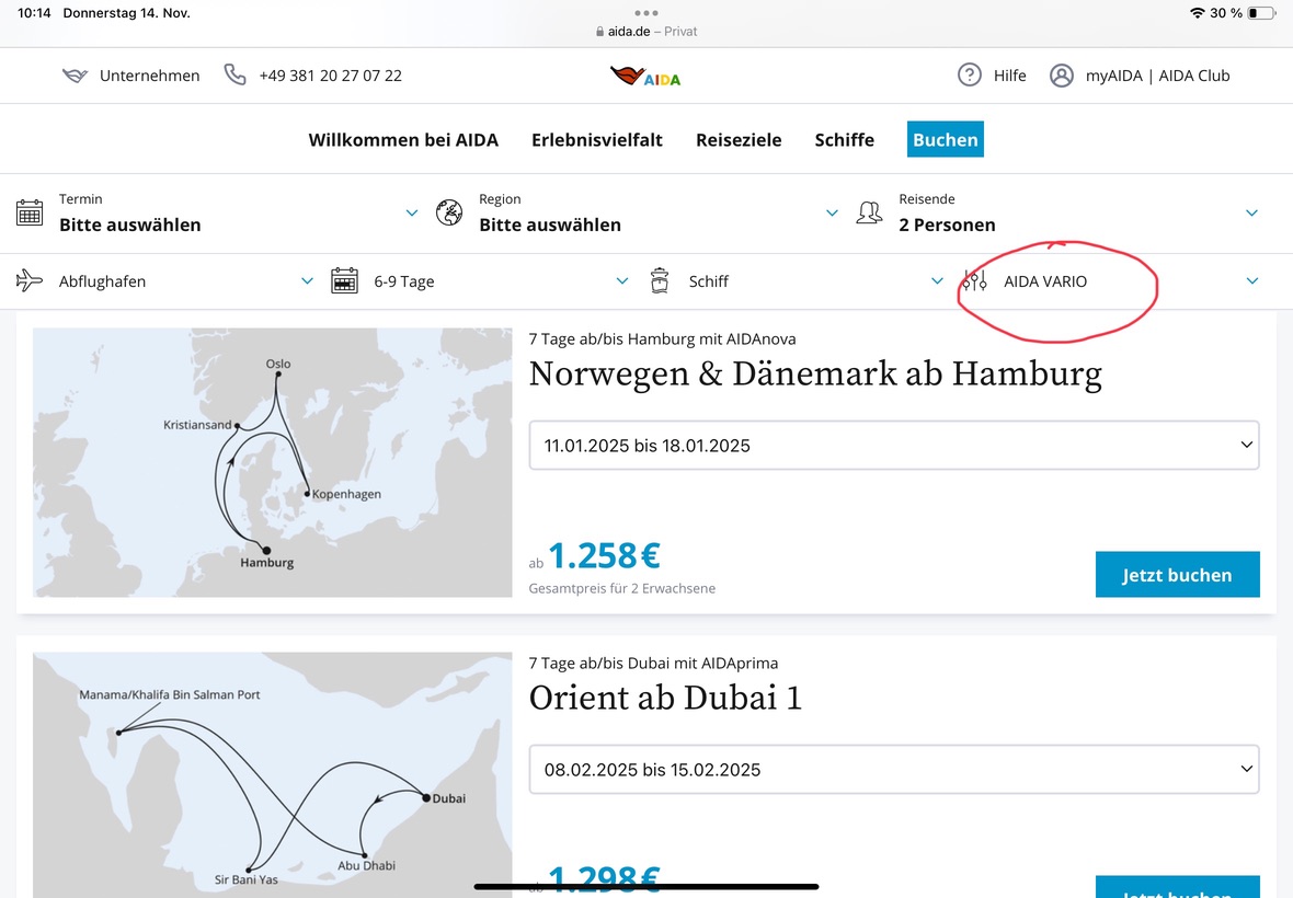 Warum ist den Vario erst später verfügbar? AIDA könnte dann einfach abwarten und (wie es ja üblich ist) ab einem gewissen Zeitraum vor Abreise die Variokabinen zuteilen.