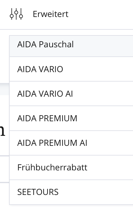 Gerade entdeckt - auf der AIDA Buchungsseite gibts jetzt im Buchungsmenü unter "Erweitert" noch mehr Auswahl.