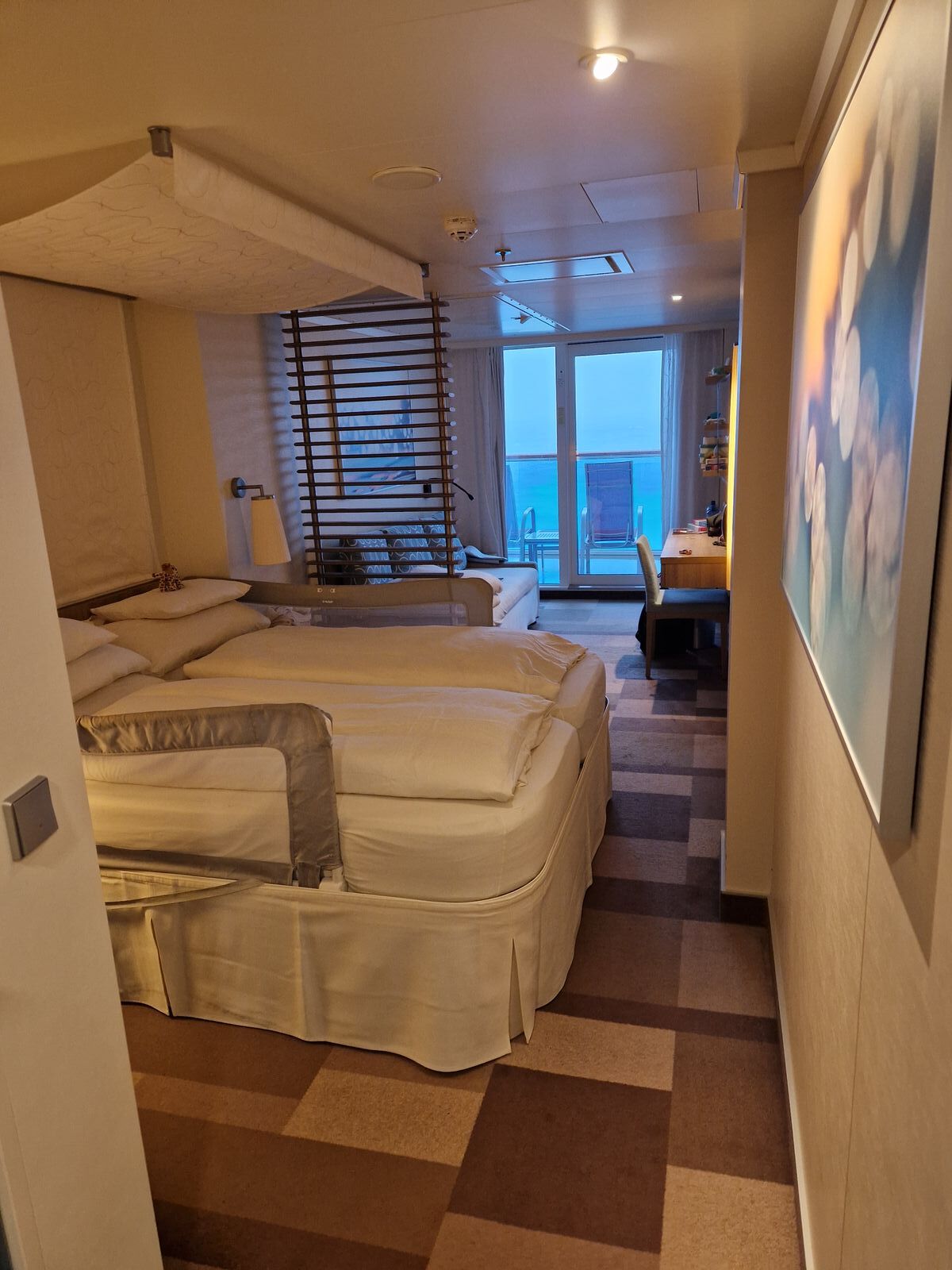 Wir haben diese Kabine im Premium gebucht, da wir gerne einmal in der "Rundung" sein wollten. Aussicht super! Es ist ausreichend Platz für vier Personen, mit kleiner Trennwand aus Holzlamellen zwischen Bett und Sofa, außerdem begehbarer Kleiderschrank.