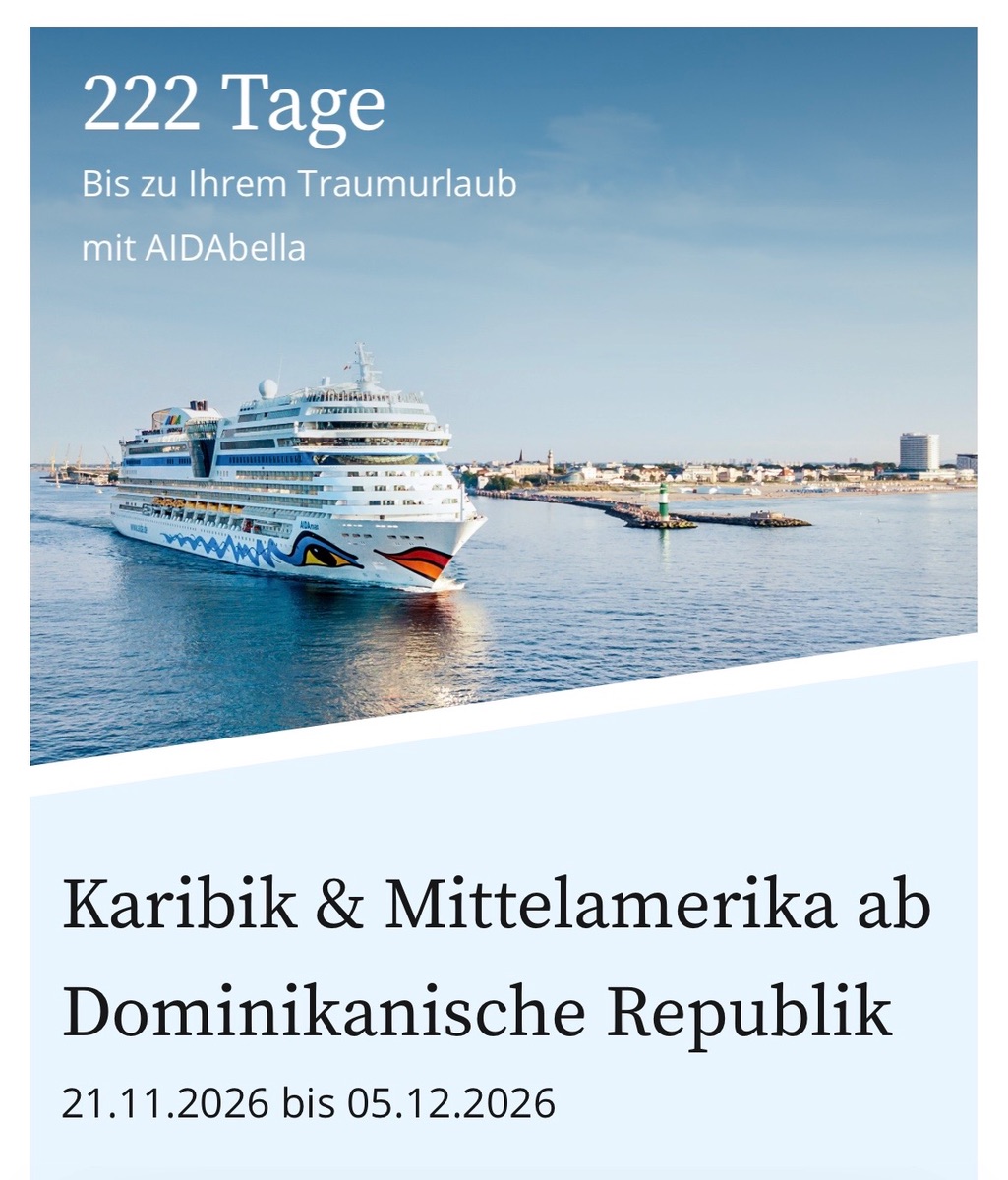 AIDAbella: Karibik & Mittelamerika ab Dominikanische Republik | 14 Nächte | 21.11.2026 bis 05.12.2026 (Samstag, 21. November 2026, 00:00 – Samstag, 5. Dezember 2026, 00:00)