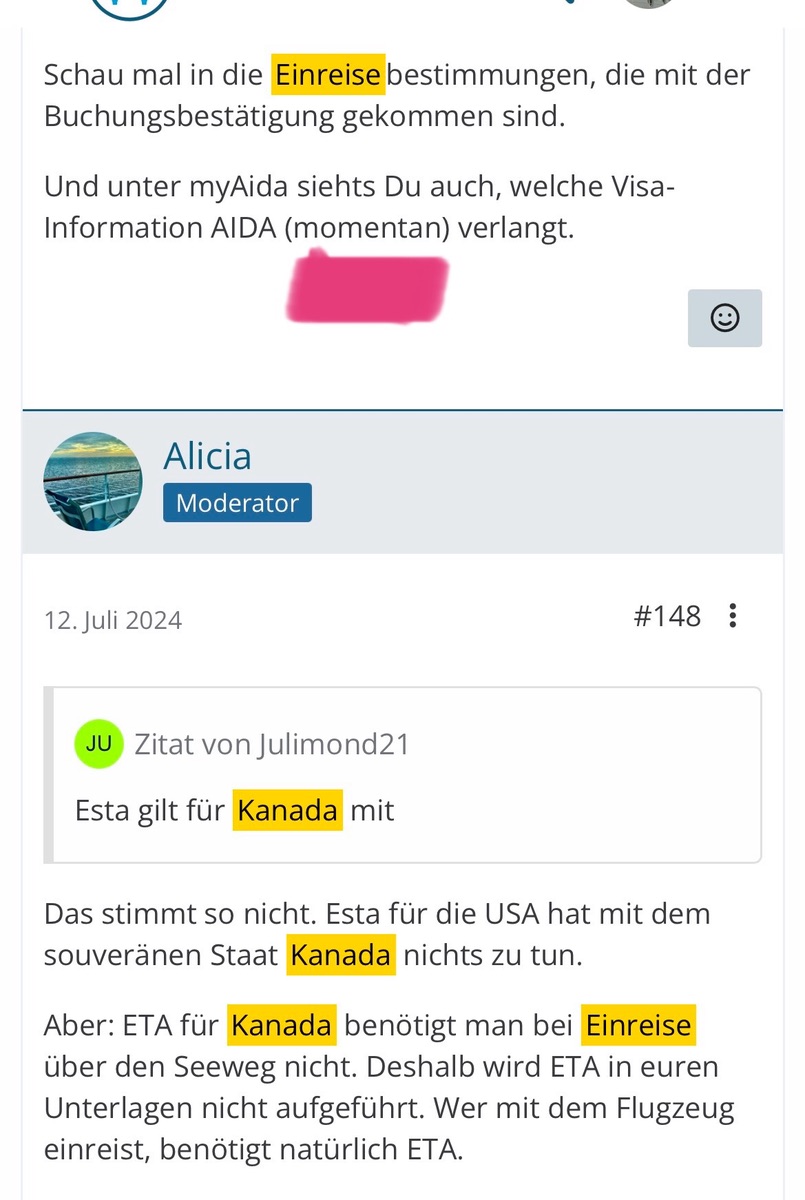 Im Faden der Einreise Kanada 🇨🇦 sind Posts von 2024 . Auch dort wurde keine eTA benötigt. Allerdings wird auch geschrieben, dass wohl Aida das verlangen kann. Schaut mal selbst, ist doch interessant finde ich.