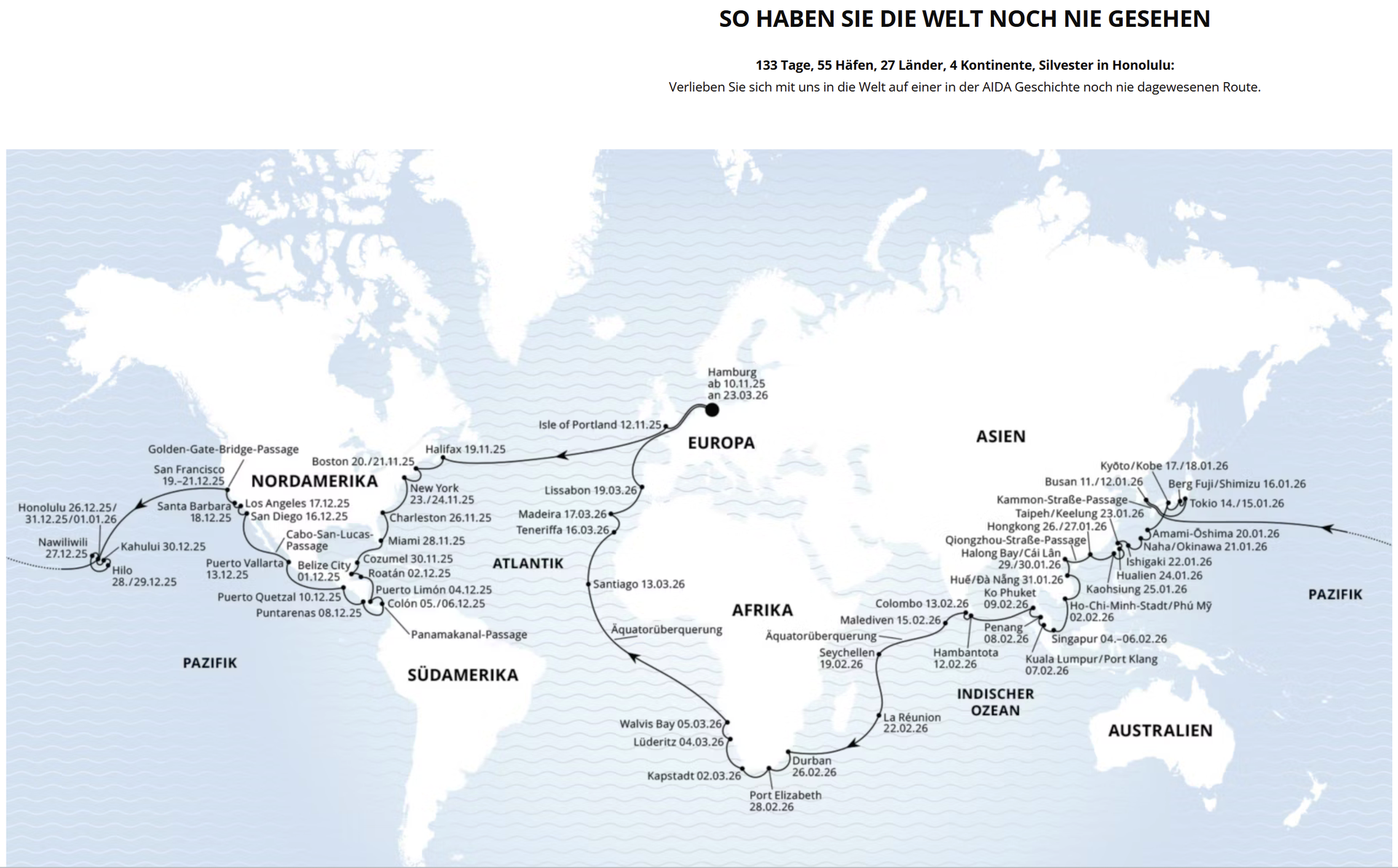 Die Weltreise geht vom 10.11.2025 – 23.3.2026.