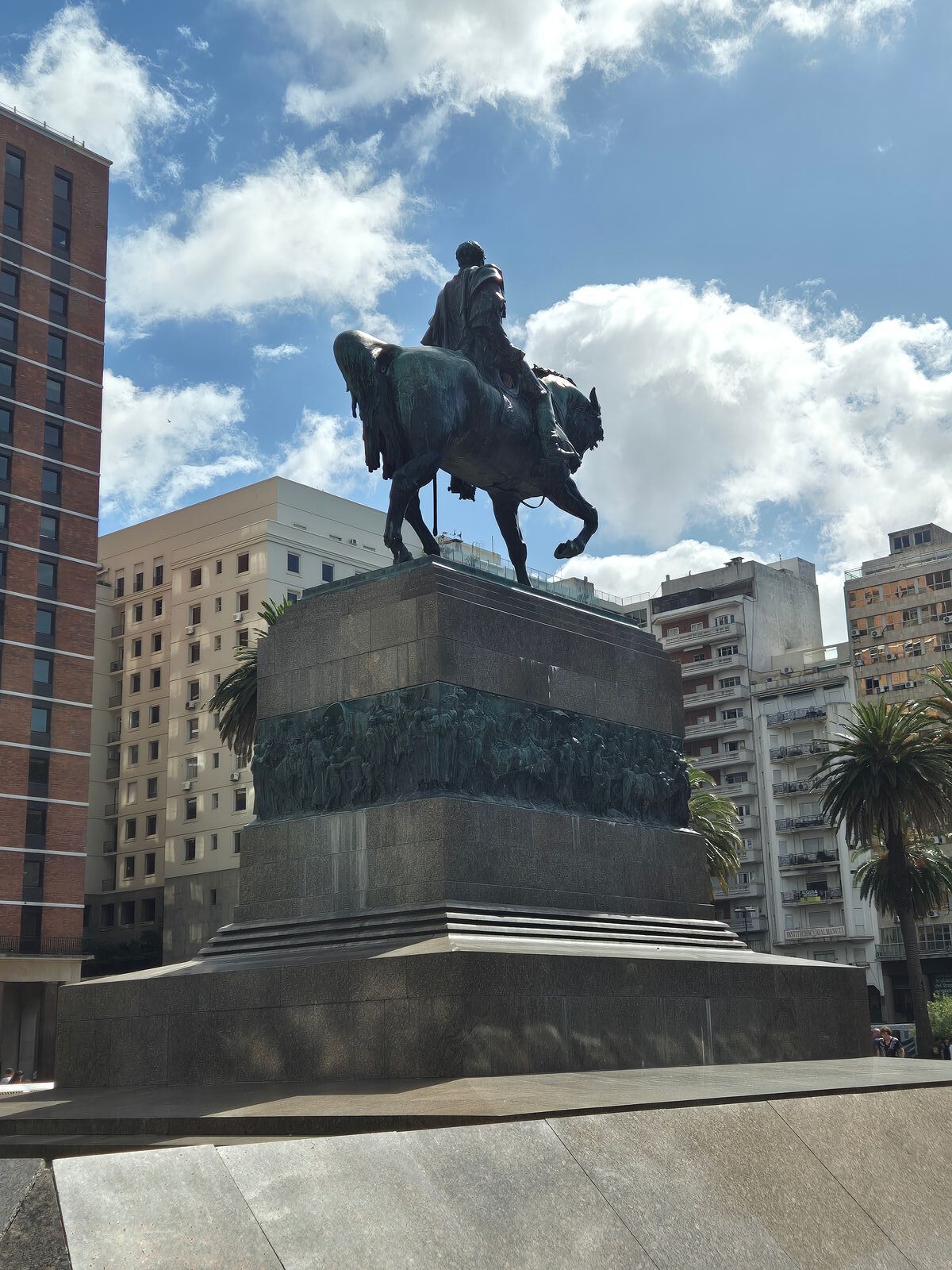 In Montevideo hatten wir den Fahrradausflug mit dem Bike Guide Tobias vom Schiff. Ich glaube wir war der Bikeguide, sowie 6 oder 7 Gäste + 2 weitere von der Crew dabei. Die Fahrräder waren Mountainbikes mit 3 x 10 Gänge. Für Montevideo natürlich völlig überzogen. Ich glaube ich habe max. 3 oder 4 Gänge benutzt. Wir sind vom Hafen direkt in die angrenzende Altstadt gefahren, haben am Plaza Constitucion mit Kirche gehalten. Danach sind wir zum Plaza Independencia gefahren und haben dort einen weiteren Stopp mit ausführlichen Infos von Tobias zu den umliegenden Gebäuden und den Monumenten. Nächster Stopp war dann an einem Aussichtsturm mit rundum Sicht auf die komplette Stadt.