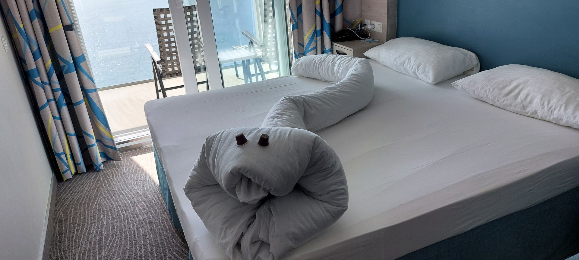 Jetzt mal einfach kurz gesagt: Die Kabine (Steuerbordseite) ist super, keine störenden Geräusche, selbst das An- und Ablegen war kaum wahrnehmbar. Wer bei Seegang empfindlich ist, wird ihn allerdings so weit vorne mehr spüren. Auch sind die Wege zu den Restaurants natürlich länger, das Pooldeck dafür schnell erreichbar. Freier Blick vom Balkon. Die Shuffleboard-Spieler, die sich auf Deck 5 darunter mal für ein Stündchen treffen, will ich hier aber nicht unterschlagen. Uns haben sie jedenfalls nicht gestört. Als einzige Besonderheit haben wir aber vor bzw. zwischen den beiden Kabinentüren so eine Art Pfosten festgestellt und darin Leitungen/Ableitungen mit entsprechenden Geräuschen befürchtet - war aber nix. Sonst sind auch meist zwei Kabinentüren in einer Nische (die Türen öffnen ja nach außen), hier eben dieser Pfosten. Vielleicht erkennt man das auf meinen Fotos.
