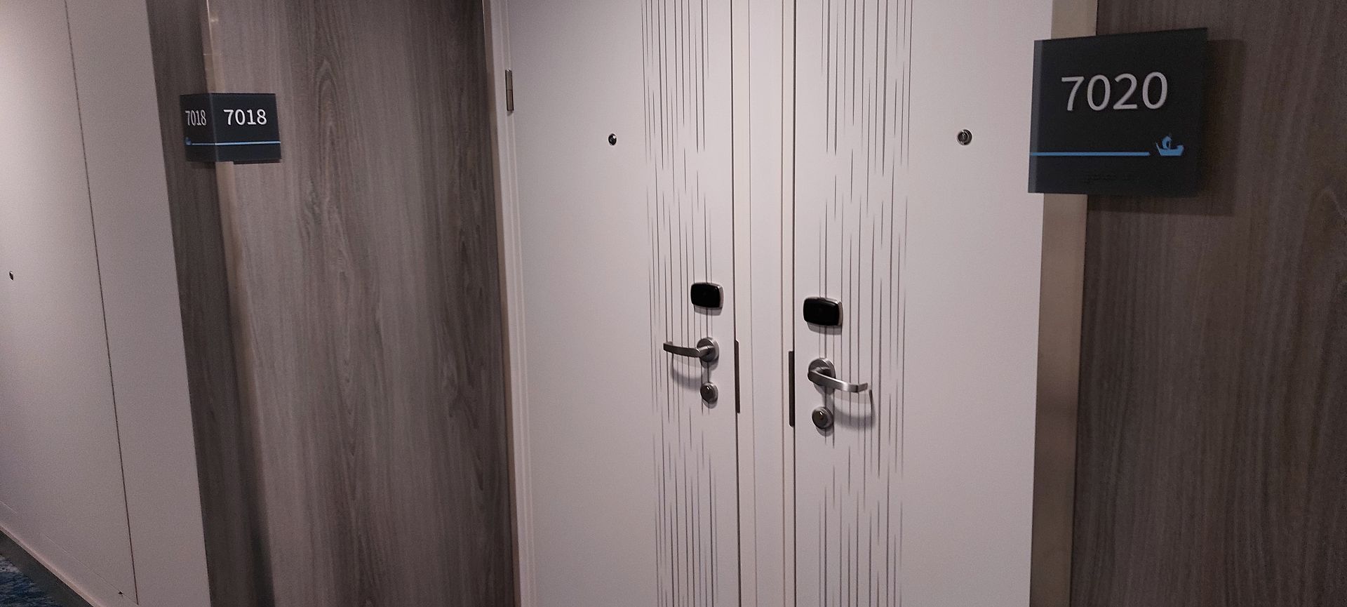 Jetzt mal einfach kurz gesagt: Die Kabine (Steuerbordseite) ist super, keine störenden Geräusche, selbst das An- und Ablegen war kaum wahrnehmbar. Wer bei Seegang empfindlich ist, wird ihn allerdings so weit vorne mehr spüren. Auch sind die Wege zu den Restaurants natürlich länger, das Pooldeck dafür schnell erreichbar. Freier Blick vom Balkon. Die Shuffleboard-Spieler, die sich auf Deck 5 darunter mal für ein Stündchen treffen, will ich hier aber nicht unterschlagen. Uns haben sie jedenfalls nicht gestört. Als einzige Besonderheit haben wir aber vor bzw. zwischen den beiden Kabinentüren so eine Art Pfosten festgestellt und darin Leitungen/Ableitungen mit entsprechenden Geräuschen befürchtet - war aber nix. Sonst sind auch meist zwei Kabinentüren in einer Nische (die Türen öffnen ja nach außen), hier eben dieser Pfosten. Vielleicht erkennt man das auf meinen Fotos.