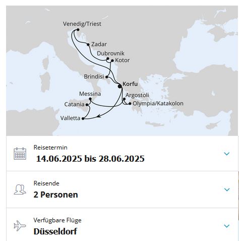 leider können wir aus privaten Gründen die Reise nicht antreten, können die Reise aber auch nicht verschieben, sondern nur auf andere Personen umbuchen. Die Reise kostet 4.920 € für zwei Erwachsene im Premium Tarif mit Flug ab Düsseldorf, Kabine 9310. Aktuell ist keine Innenkabine mehr buchbar, das günstigste vergleichbare Angebot liegt bei 6.220 € in einer Meerblickkabine. Umbuchungskosten übernehmen wir selbstverständlich.