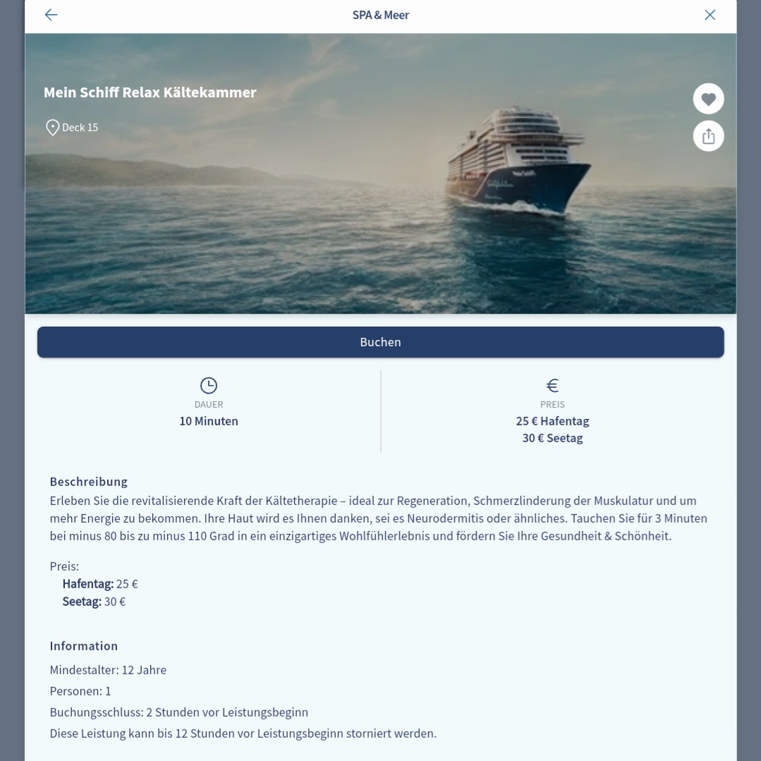 Hallo Ihr Lieben, kennt schon jemand die Preise bezüglich der Kältekammer an Bord der Relax?