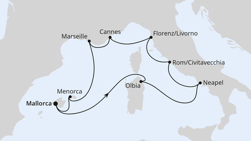 Routenverlauf: Palma De Mallorca – Erholung auf See – Olbia – Neapel – Rom / Civitavecchia – Florenz / Livorno – Cannes – Marseille– Erholung auf See – Mahón/Menorca (wurde angepasst) – Palma De Mallorca