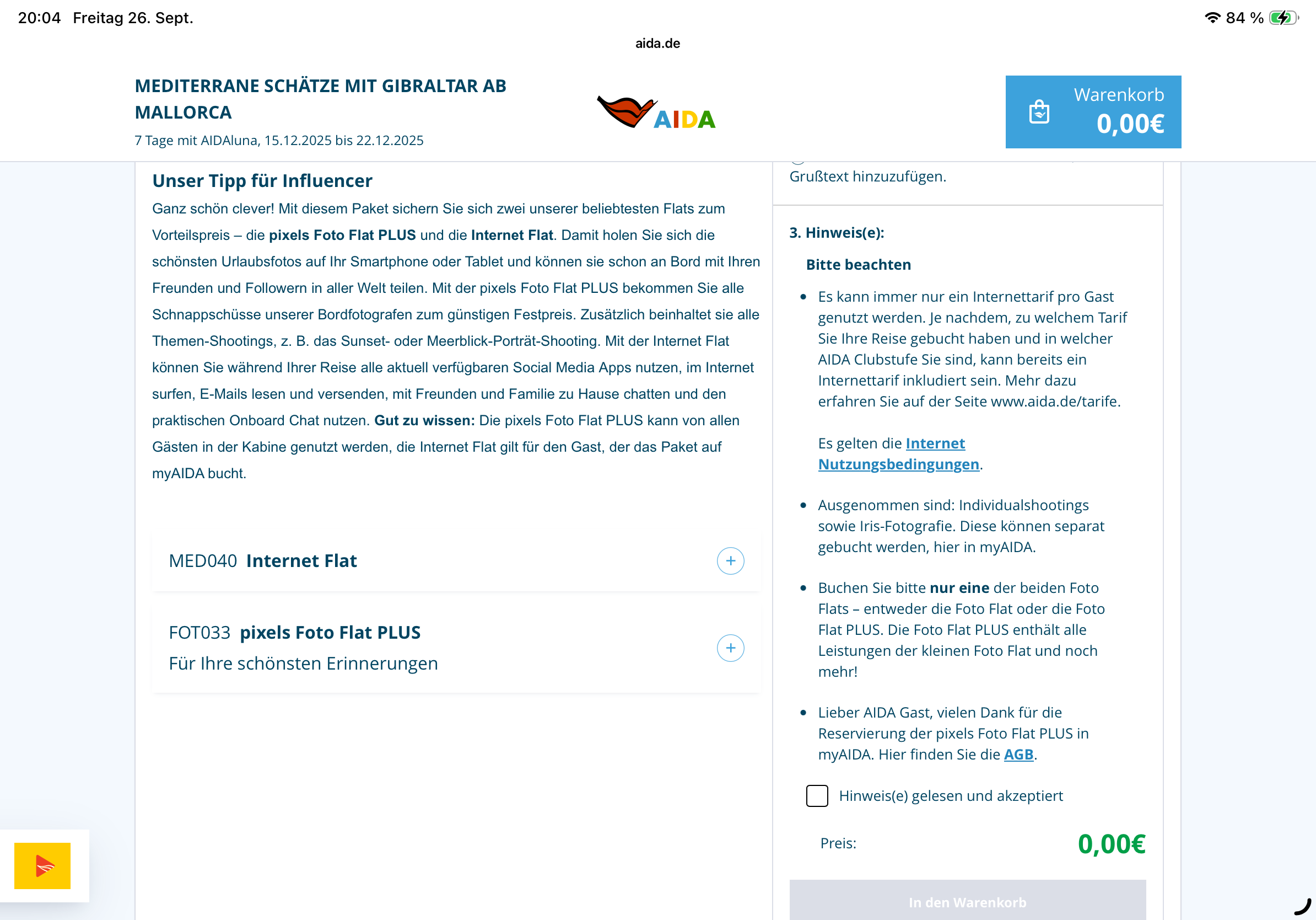 …hat sich erledigt, ich kann es für meine Reise mit der Prima im Dezember auch buchen. -