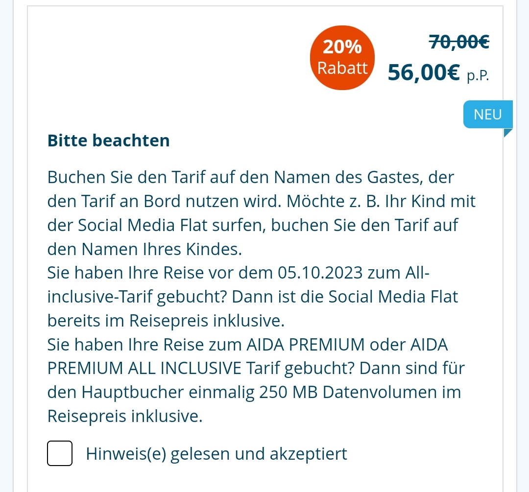Dann dürfte Aida diesen Tarif für alleinreisende Gäste aber nicht erhöhen, tun sie aber und das in gleichem Ausmaß ...
