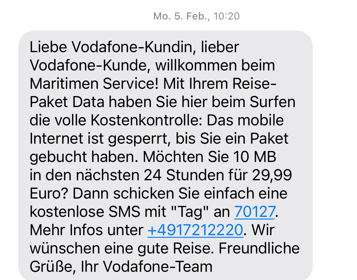 Dann soll Schatzi das nochmal checken lassen. Vodafone hat von Haus aus die Sperre drin, Maritimes Netz muss aktiviert werden. Quelle: Ich bin bei Vodafone.