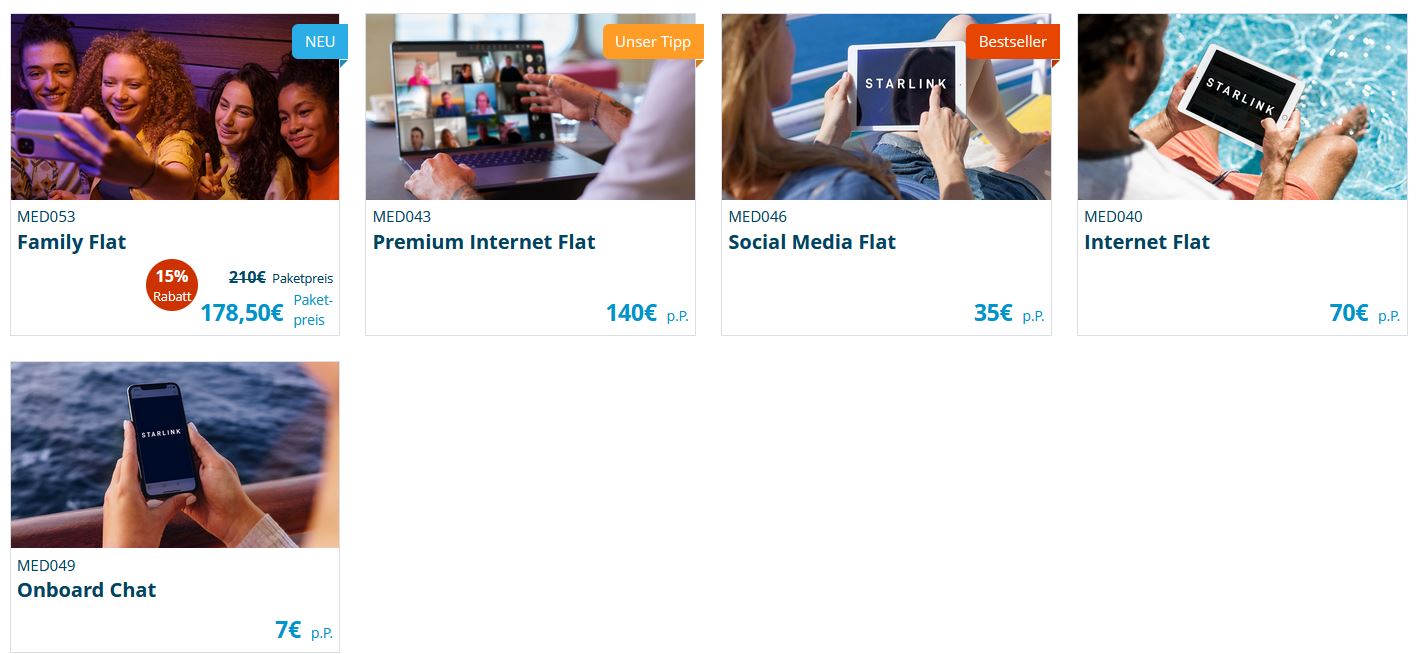On Bord Chat 7,00 € / SMF 35,00 € / Internet Flat 70,00 € / Premium Internet Flat 140,00 € alle ohne Rabatt - Family Flat 210 € ./. 15 % = 178,50 € ( ist eine Premium Flat für bis zu 4 Geräten )