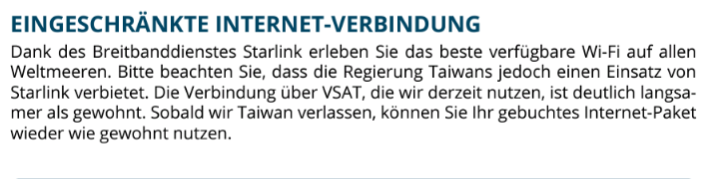 Z. B. Taiwan und Hongkong inkl. Hoheitsgewässer hätten auf unserer Januarcruise das Abschalten von Starlink verlangt...