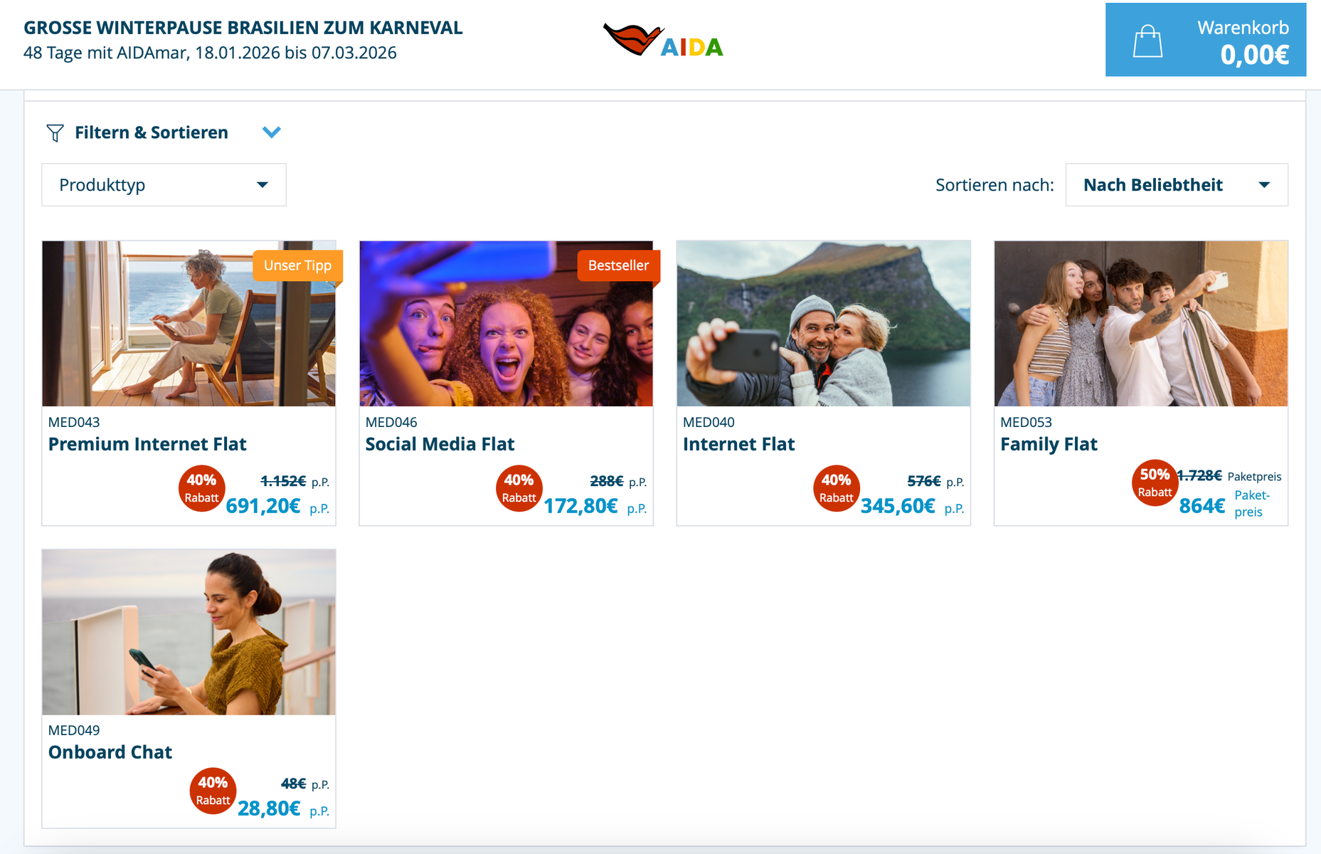 Für unsere letzte Karibik-Reise (14 Tage, 02/2025) gab es eher weniger Rabatt, aber immerhin etwas - ich im Rahmen der "Black Friday Aktion" 2024.Für unsere 48-tägige Winterpause Brasilien mit AIDAmar, welche im Januar 2026 startet, wurden am 28.03.25 die Internet-Tarife unter myAIDA eingestellt.