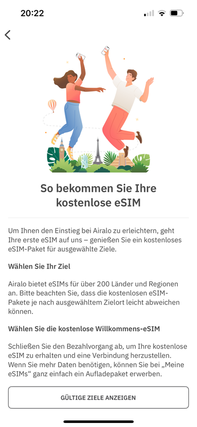 Habe gerade gesehen, dass es bei Airalo für einige Länder gerade eine kostenlose eSIM gibt. Gültig für einen Tag, 1 GB Datenvolumen.