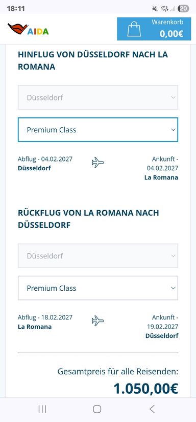 Wir haben für Nov. 2026 Karibik gebucht und fliegen bis jetzt von Düsseldorf. Da wir uns nun überlegt haben EcoPremium zu buchen wollte ich dies unter "MyAida" buchen. Jedoch ist dies nur mit Abflug Frankfurt möglich. Kann mir jemand sagen ob dies auch noch möglich wird mit Abflug Düsseldorf (evtl. Aida Vollcharter)? Danke