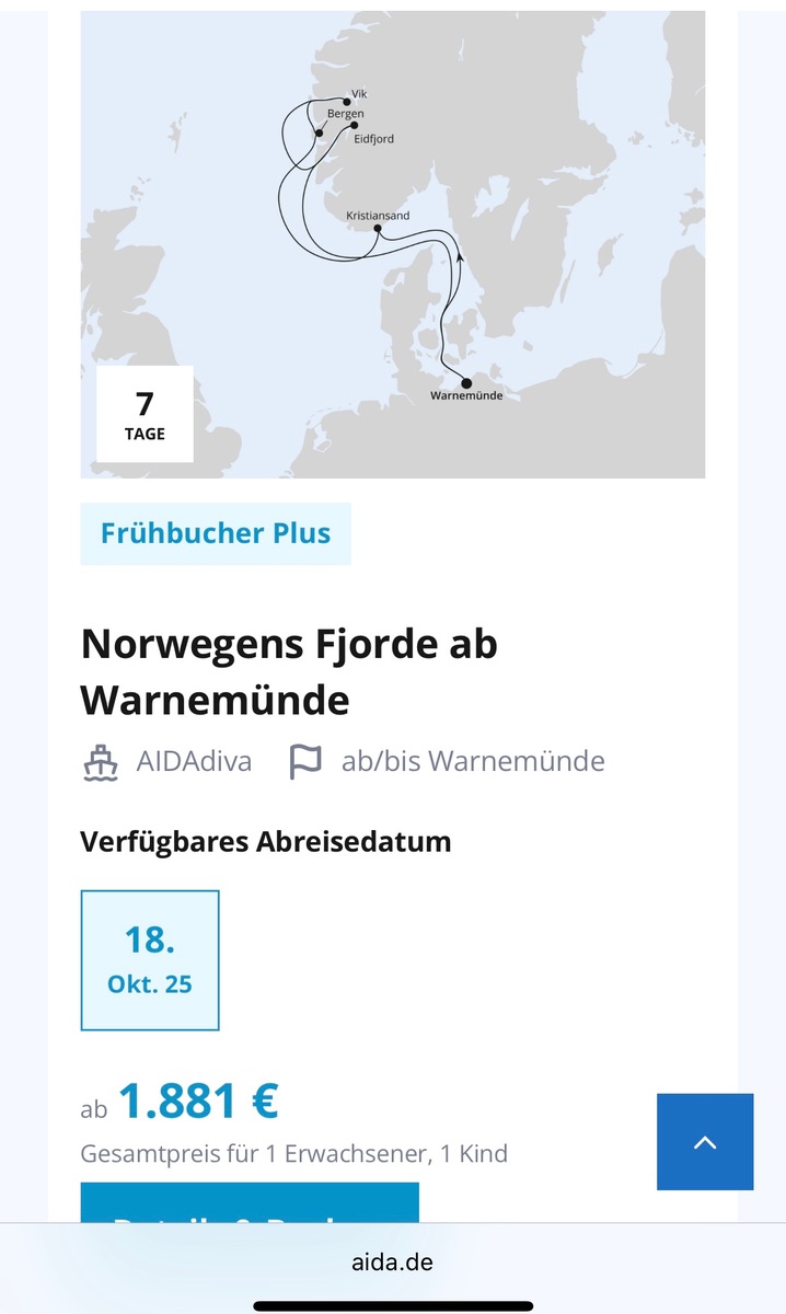 Die Fahrten finden Ende Oktober statt, viele schrieben, da macht die Fjordetour wenig Sinn, da es bei Ein- und Ausfahrten häufig dunkel ist und das Wetter oft nicht mitspielt, sodass es öfter zu Streichungen von Halten kommt. Hat man großes Pech, verbringt man - etwas übertrieben gesagt - 7 Tage im Dunkeln auf dem Schiff 😅 Dafür spricht, dass die Diva modernisiert wurde, nicht so überlaufen ist und wir eine sehr kurze Anreise nach Warnemünde hätten.