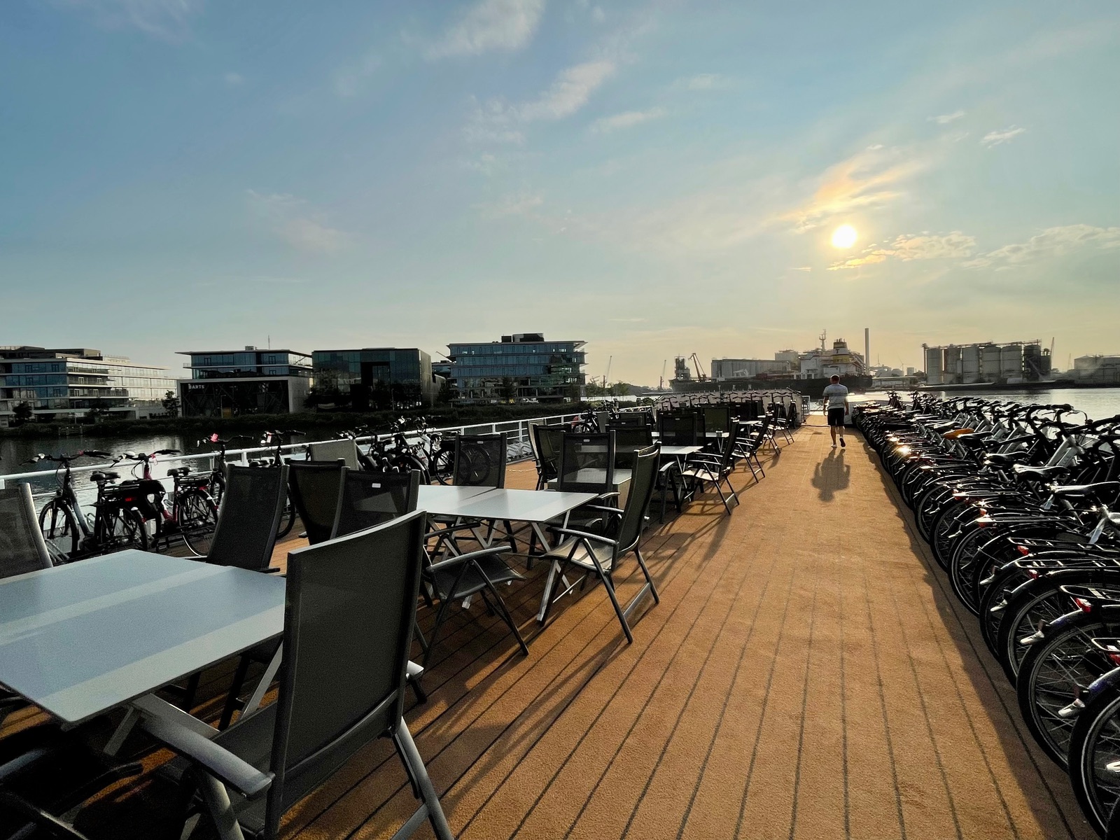 Man kann übrigens sein eigenes Rad mitbringen oder eins von Bord benutzen.